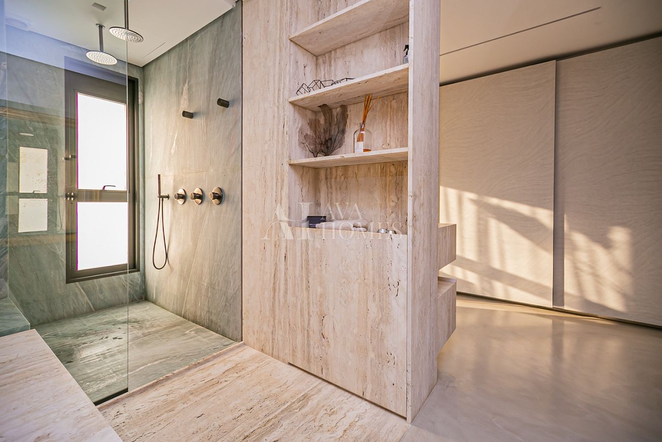 O living integrado se abre em amplitude com piso monolítico contínuo, travertino romano e automação invisível. A iluminação, o som ambiente e o ar-condicionado central embutido funcionam com perfeição sem interferir na arquitetura.