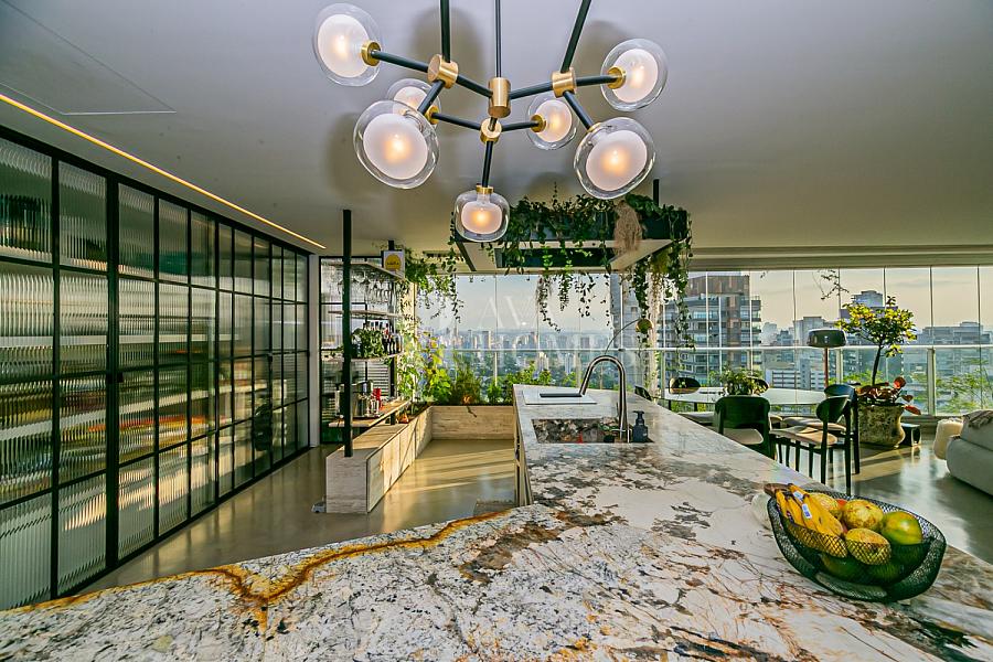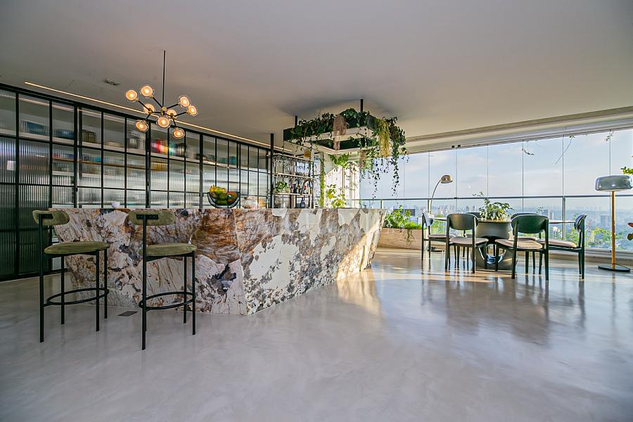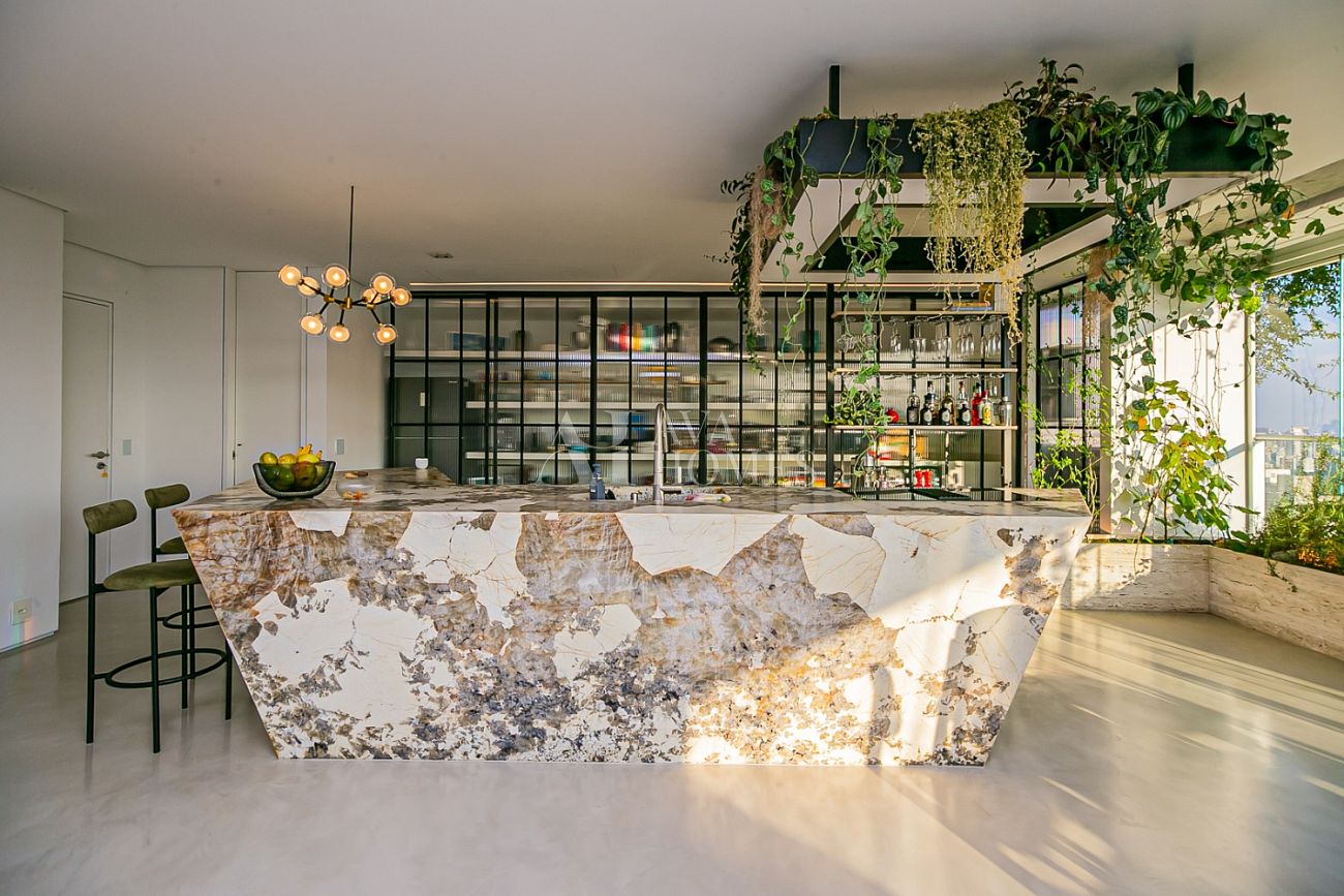 Uma ilha escultural em Pedra Patagônia, executada em grandes chapas, organiza o espaço e transforma o cotidiano em experiência. Ao redor dela, uma dinâmica natural: receber, cozinhar, conversar, permanecer.