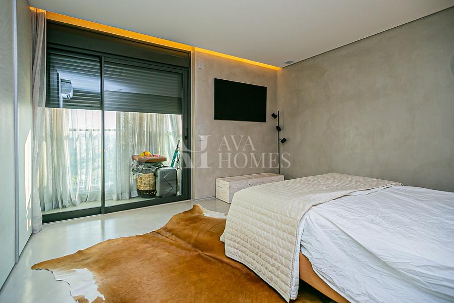 A suíte master combina superfícies minerais, iluminação delicada e integração fluida com o closet. A suíte de hóspedes traz concreto aparente, marcenaria sob medida e uma atmosfera contemporânea, acolhedora e funcional.