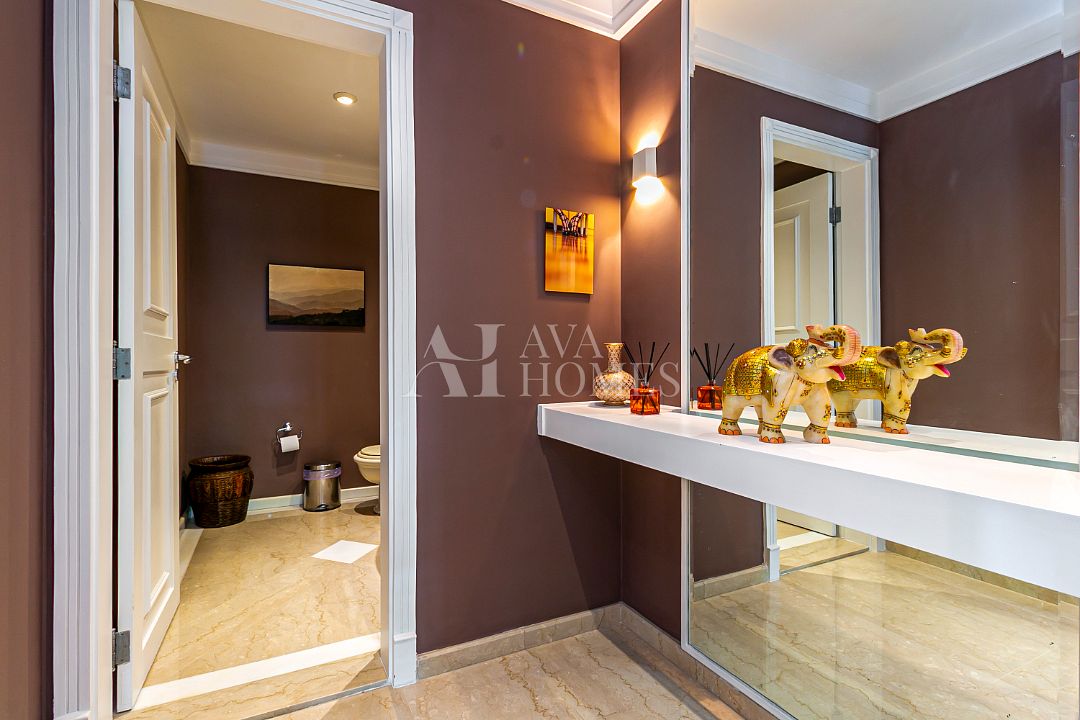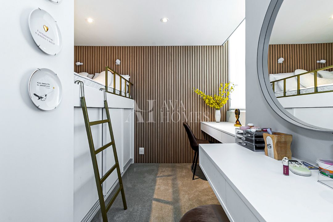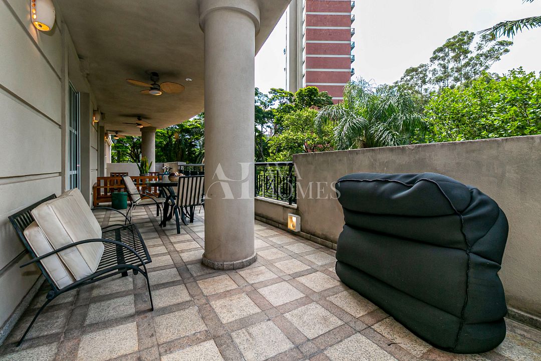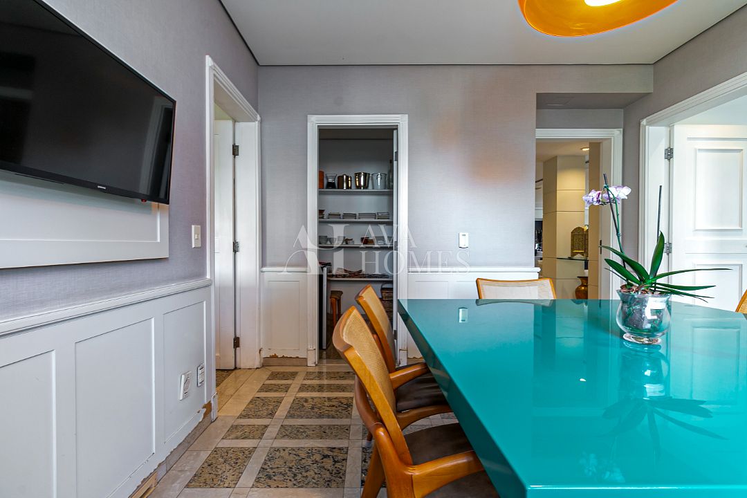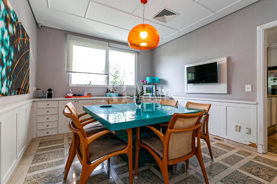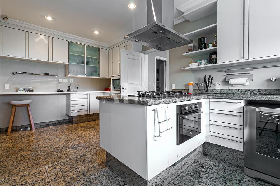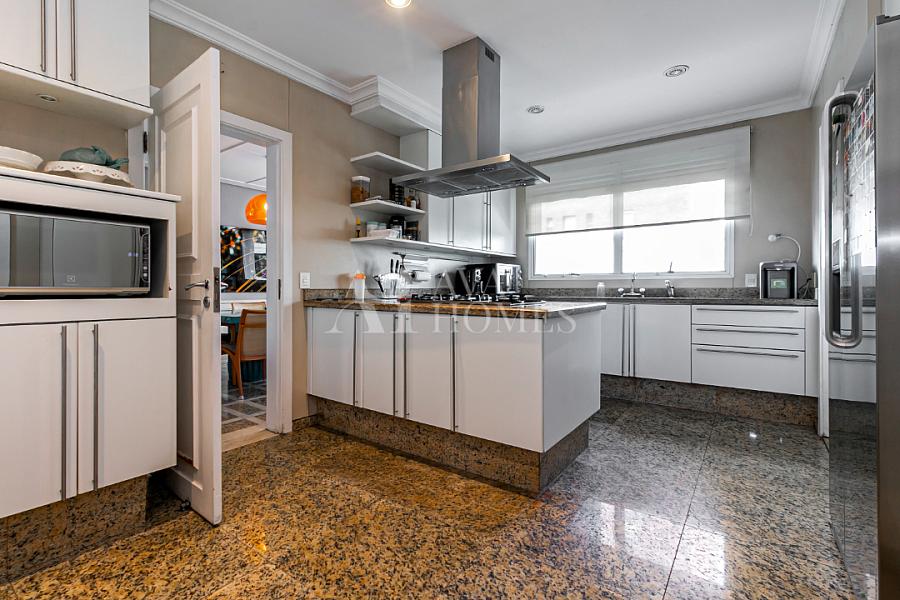 A cozinha tem um design funcional, despensa, ilha central e grandes janelas que oferecem uma vista encantadora. Além disso, a unidade conta com copa, dependências completas para funcionários e um terraço de apoio exclusivo desta unidade, um diferencial raro.