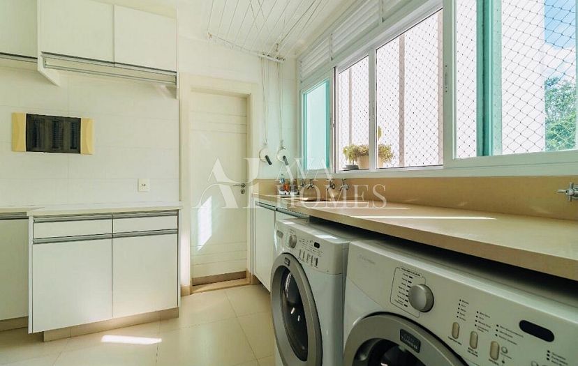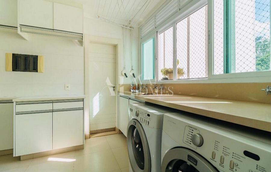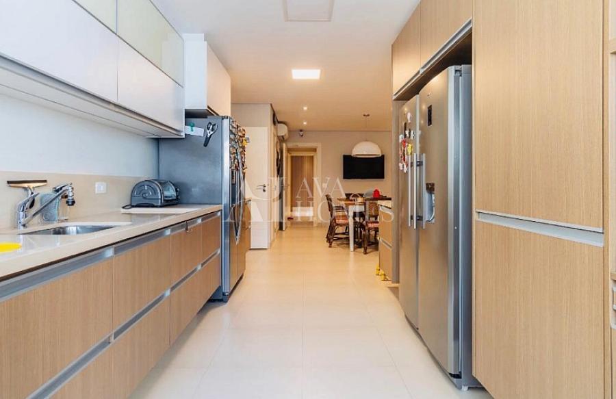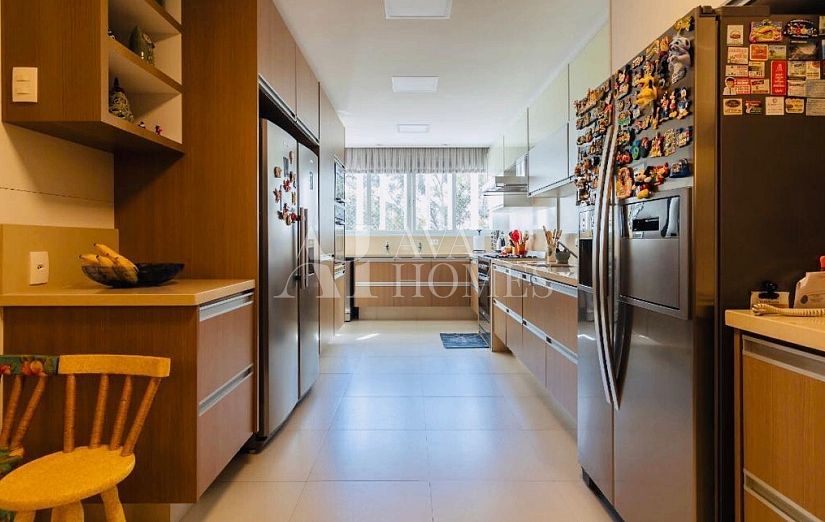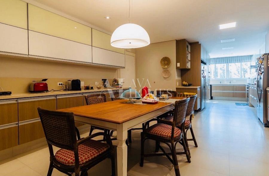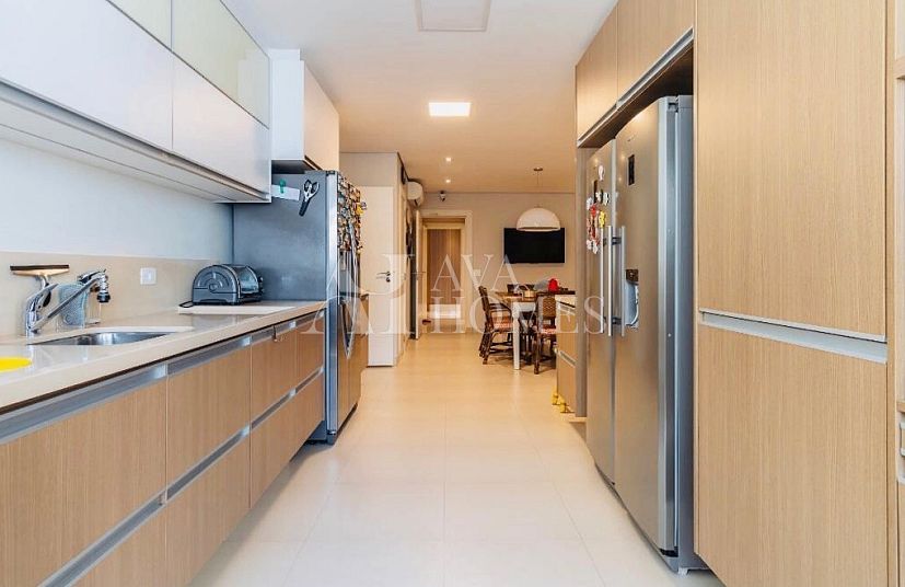 A cozinha planejada é funcional e moderna, complementada por uma área de serviço completa e dependência para funcionários. O apartamento conta ainda com 3 vagas de garagem bem posicionadas. Possibilidade de porteira fechada por R$ 6.200.000.