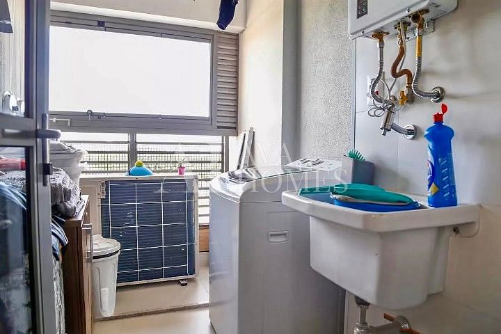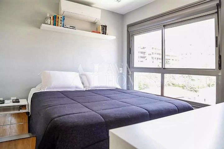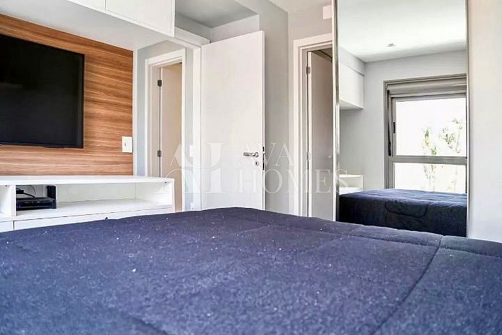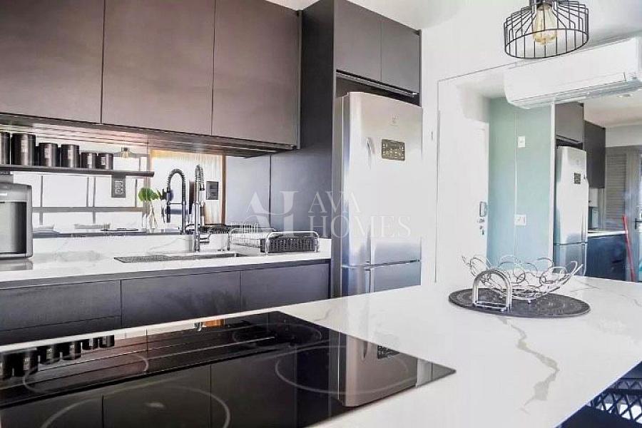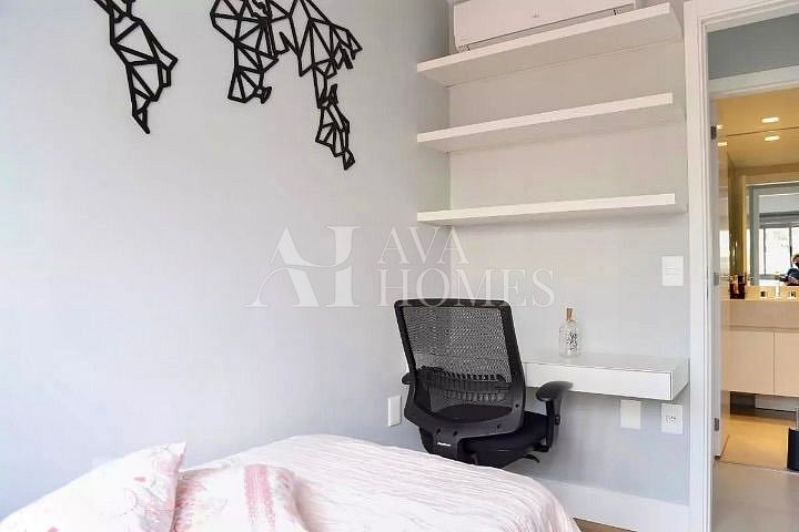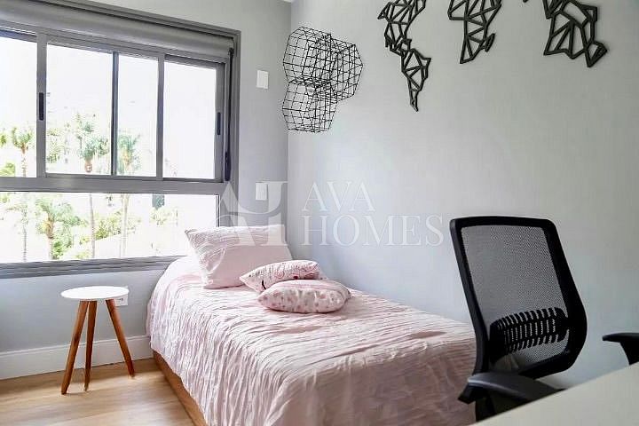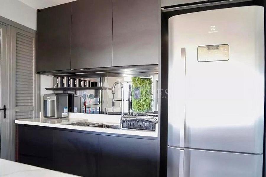 A cozinha já está equipada com cooktop, forno elétrico, geladeira importada e filtro. Nos dormitórios, armários planejados e, na suíte, uma cama queen sob medida com gavetões e bancada de trabalho completam a proposta com inteligência e conforto.