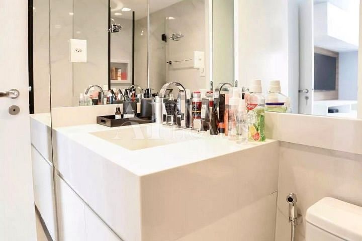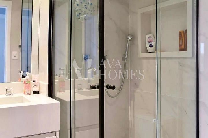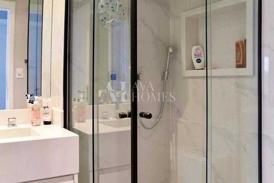 A iluminação foi inteiramente desenhada e adquirida na Labluz, com sistema dimerizável em toda a área social. Cortinas automatizadas na sala de jantar e na suíte, metais Deca, pias esculpidas sob medida e climatização com ar-condicionado e aquecimento a gás superdimensionados elevam ainda mais o padrão.