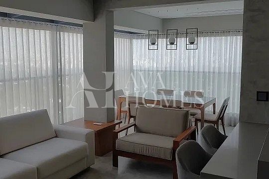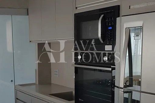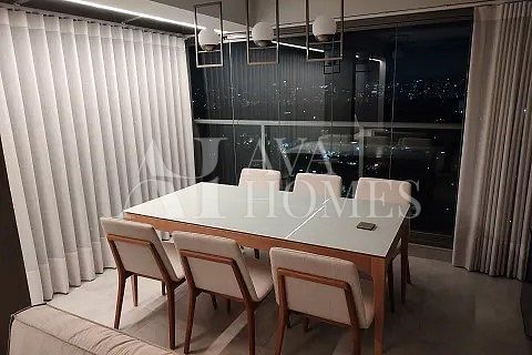 A área de jantar desfruta da melhor vista, com uma mesa para seis lugares, adega e cervejeira. O espaço de estar possui um sofá, poltrona, mesa envolta na coluna, móvel planejado para TV e som, com iluminação decorativa integrada ao sistema automatizado. Além disso, há um lavabo decorado. A suíte foi ampliada, incluindo um espaço de escritório com móveis planejados, TV e internet já instaladas. Grandes armários, espelho, cama de casal box com cabeceira planejada, cortinas com controle remoto, todos os detalhes foram cuidadosamente selecionados para proporcionar o máximo conforto. A suíte também é decorada e totalmente equipada, com metais e móveis de alta qualidade. A área de serviço inclui armários, tanque, máquina de lavar e aquecedor, com acesso à área técnica, onde estão instaladas as esquadrias e vidros de fechamento e divisórias.