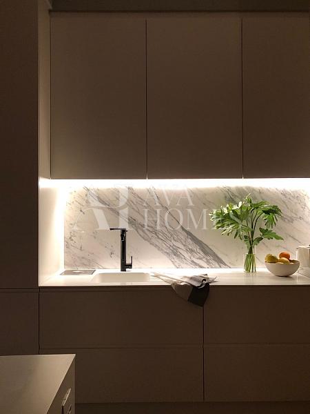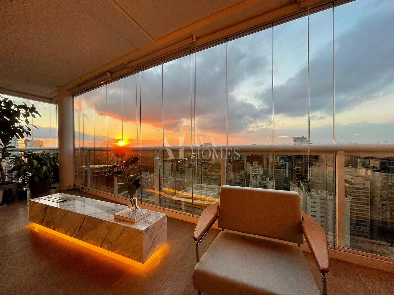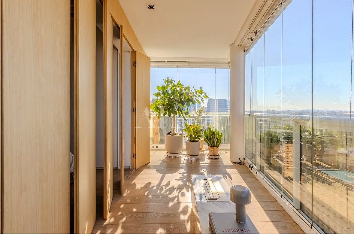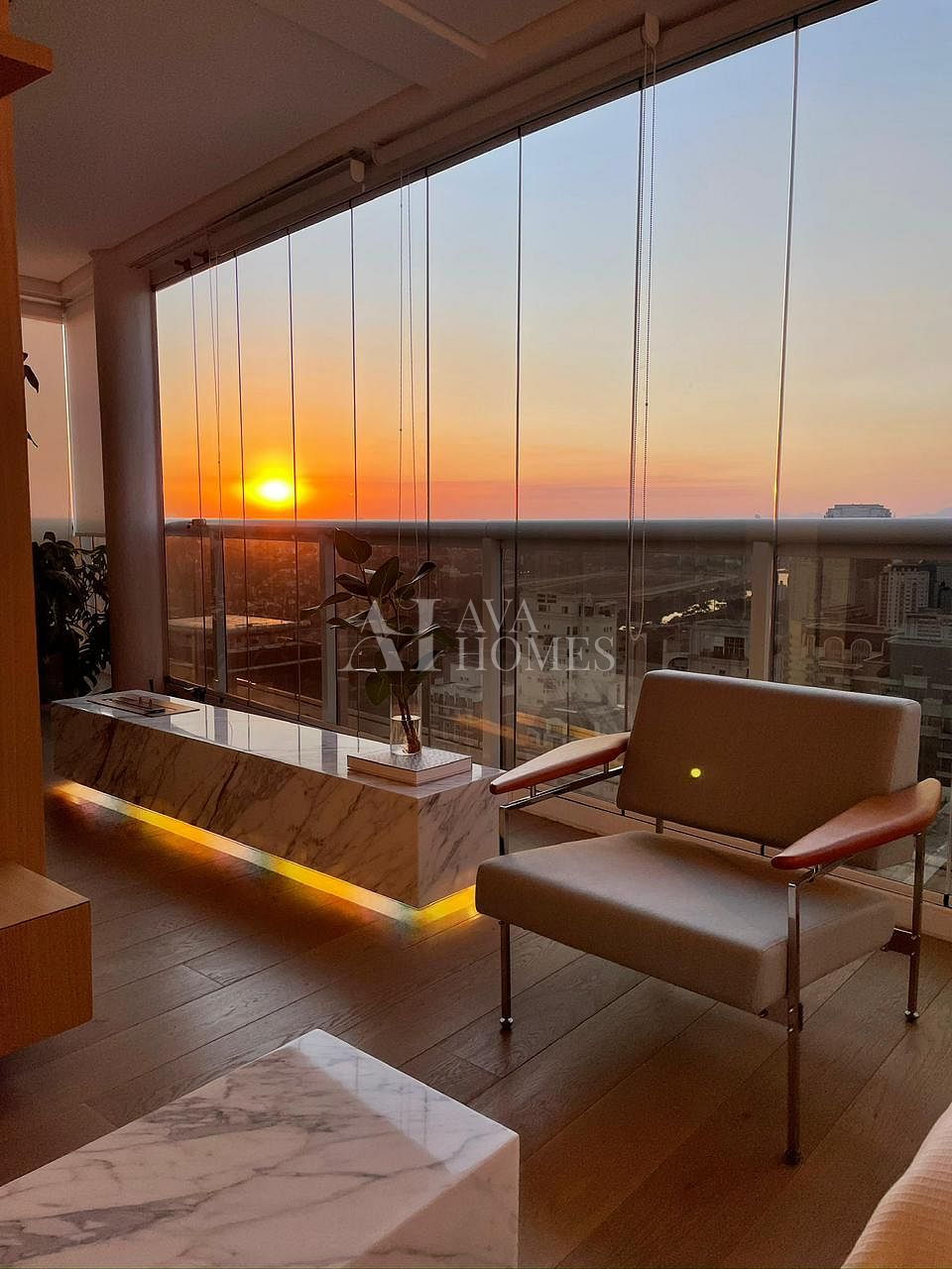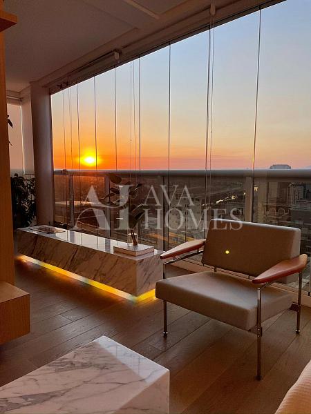 Os eletrodomésticos embutidos Gorenje e Tecno elevam o padrão, enquanto a bancada da pia e a mesa de jantar em Corian criam aquele visual limpo e contemporâneo que todo mundo ama. Os banheiros exibem mármore Carrara, presente também nas duas mesas de centro, trazendo harmonia e elegância. Cortinas Uniflex completam a atmosfera com suavidade. A vista no trigésimo sexto andar é simplesmente um presente diário.