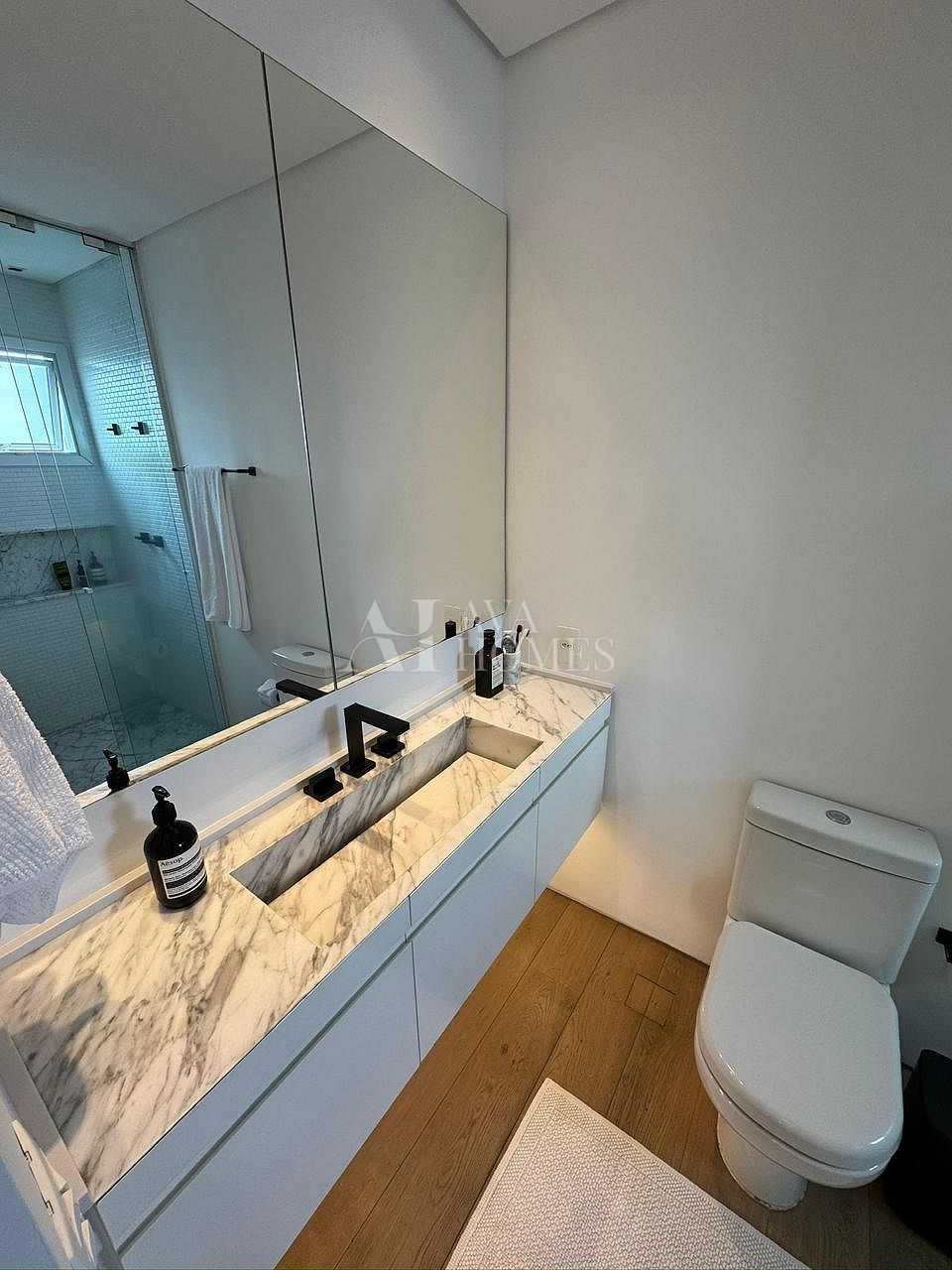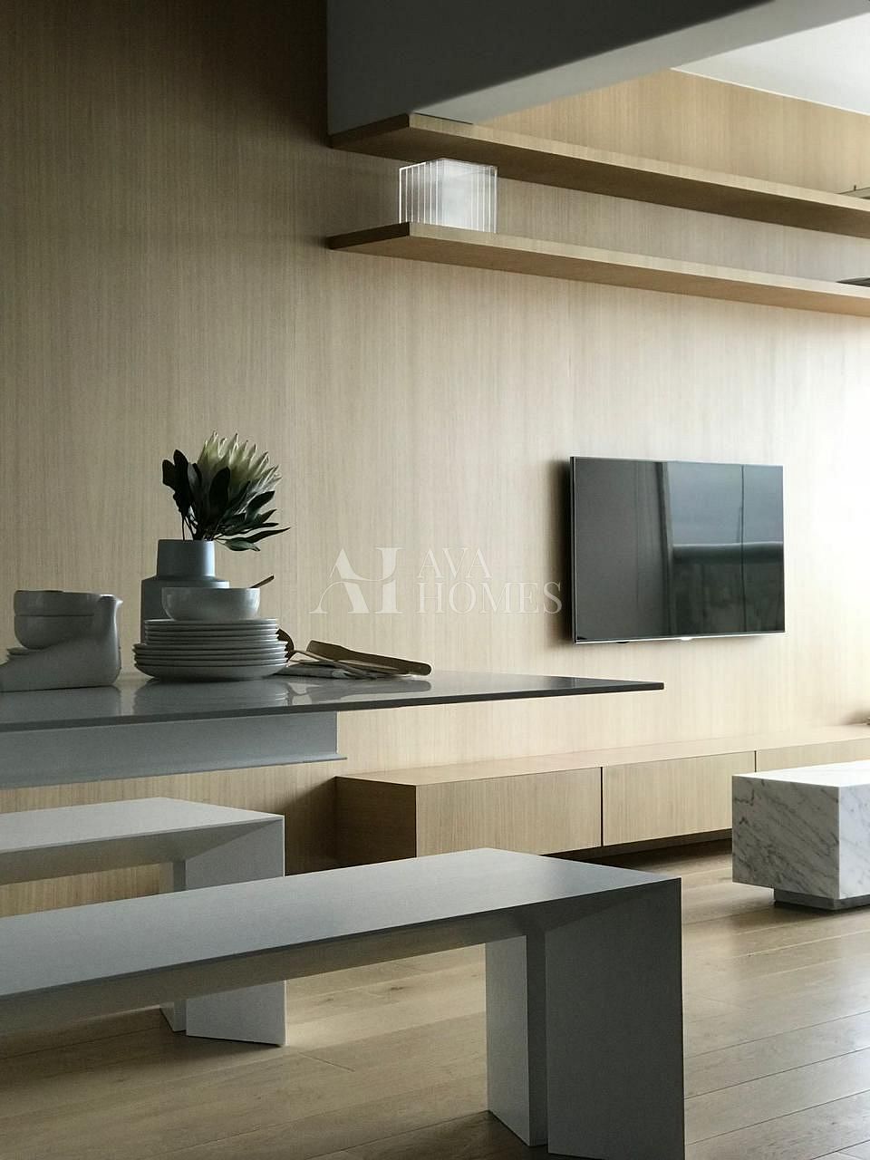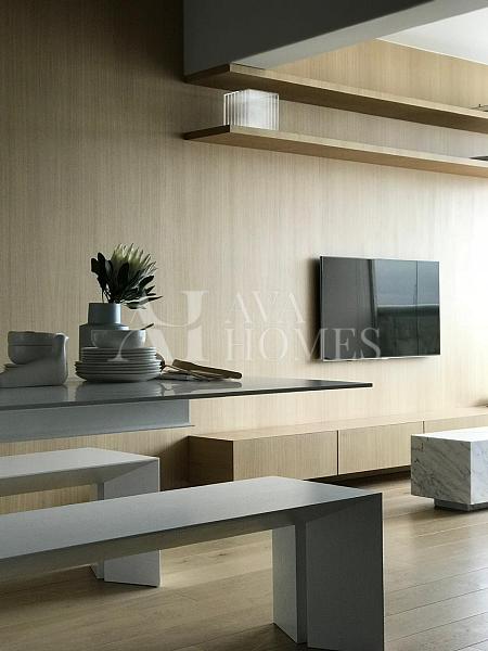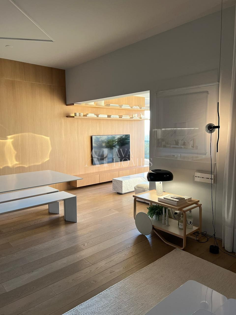 Projeto impecável do Nildo José, com uma cozinha premiada pela Deca que já entrega o tom de refinamento do espaço. O pé direito de três metros amplia tudo, o piso de carvalho francês da Oscarono aquece o ambiente, e a marcenaria em laca conversa perfeitamente com a parede da sala revestida em madeira.