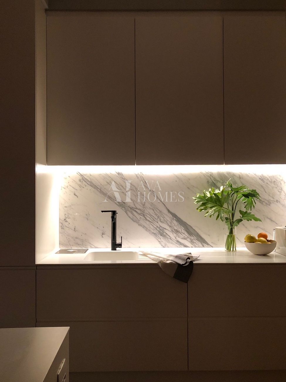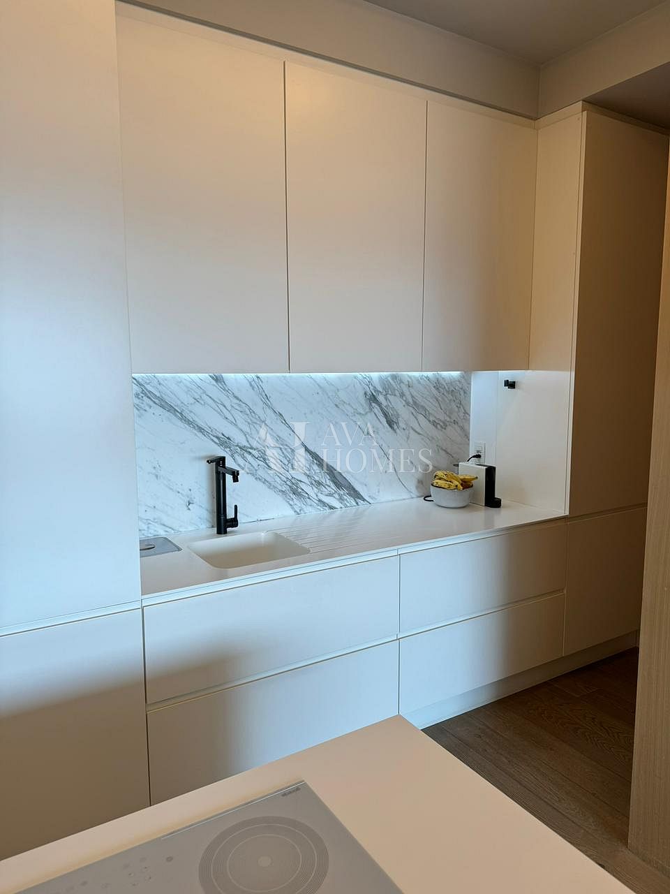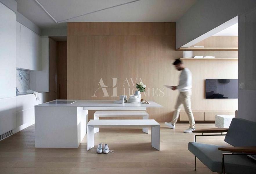 Projeto impecável do Nildo José, com uma cozinha premiada pela Deca que já entrega o tom de refinamento do espaço. O pé direito de três metros amplia tudo, o piso de carvalho francês da Oscarono aquece o ambiente, e a marcenaria em laca conversa perfeitamente com a parede da sala revestida em madeira.