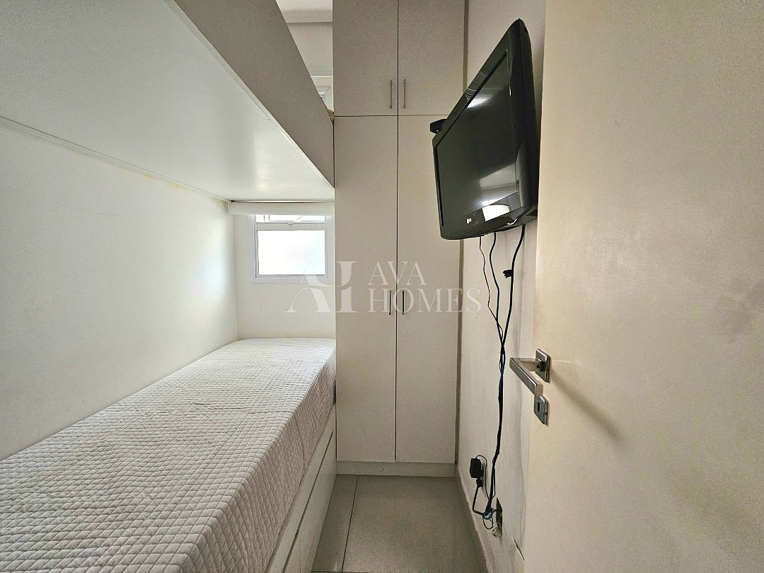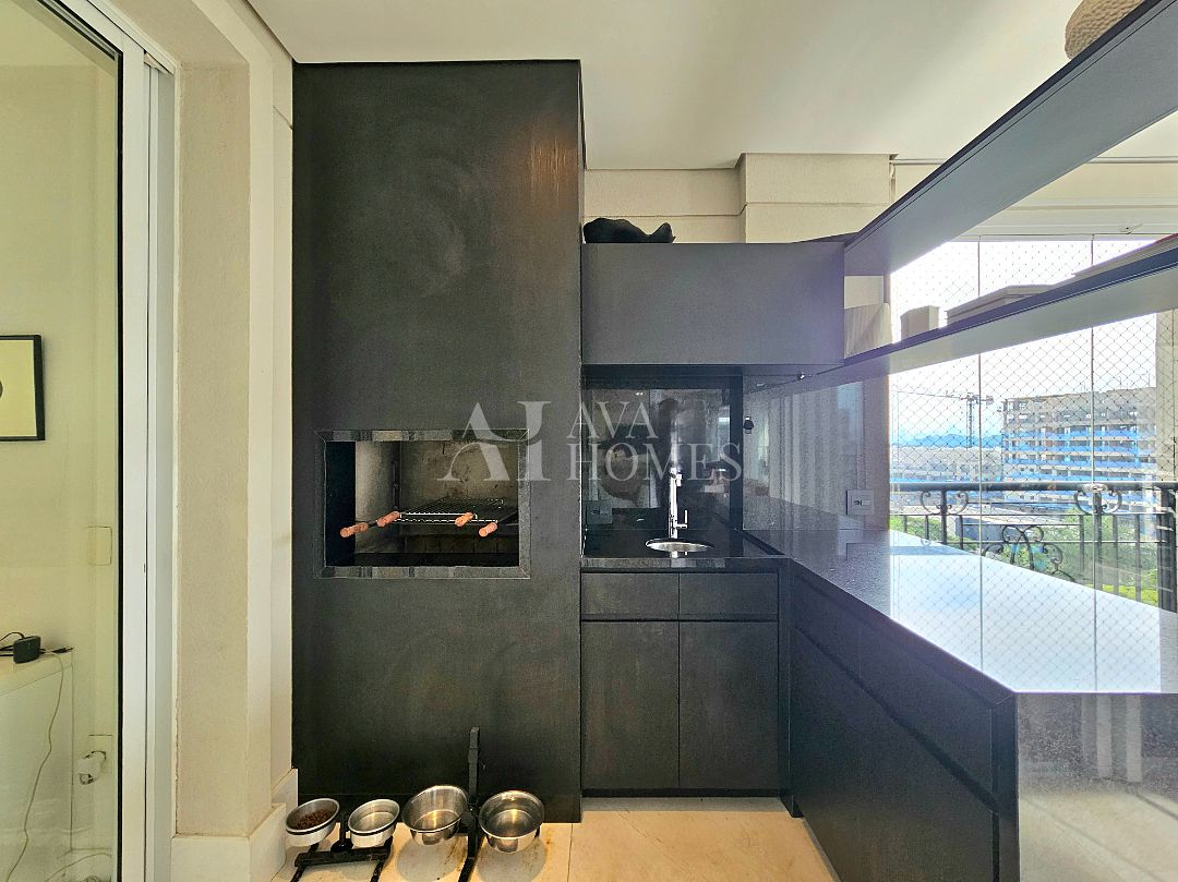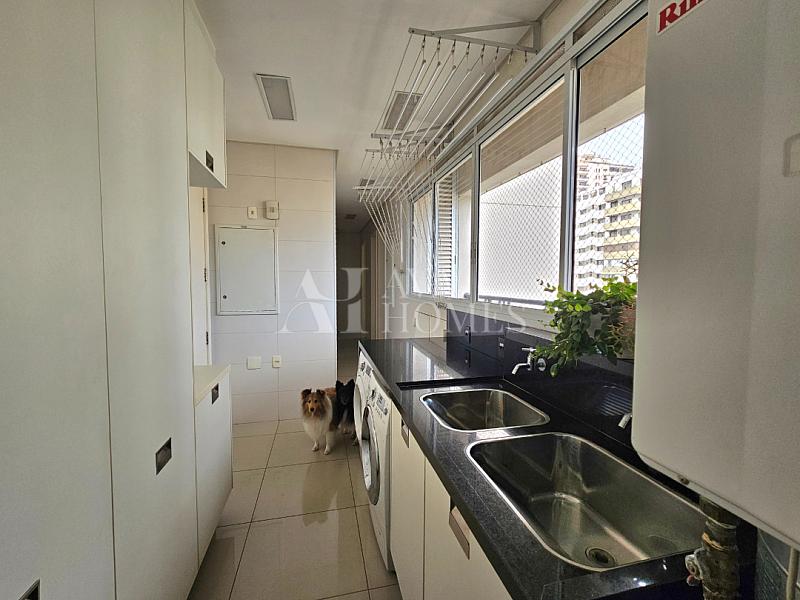 Cozinha e lavanderia com armários Ornare, além de despensa, quarto e banheiro de serviço.