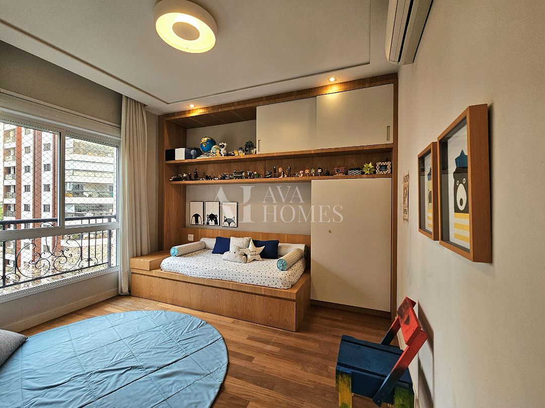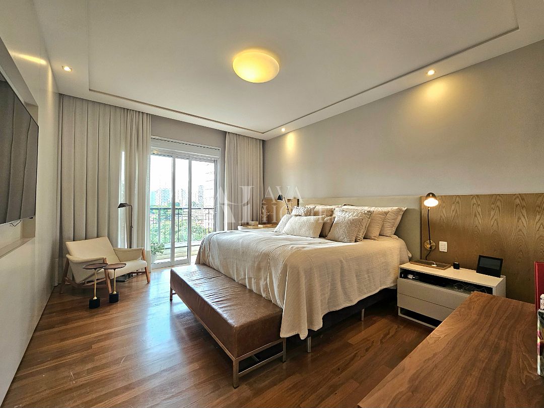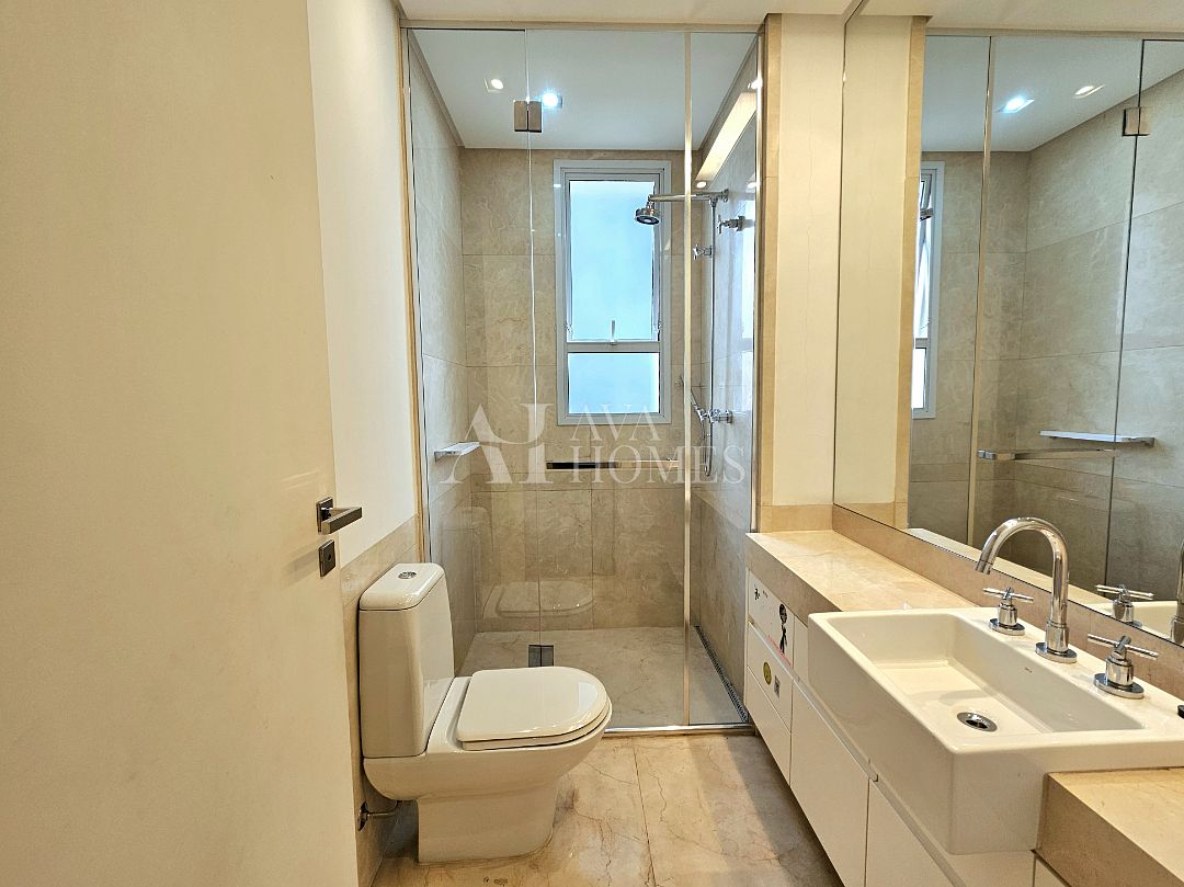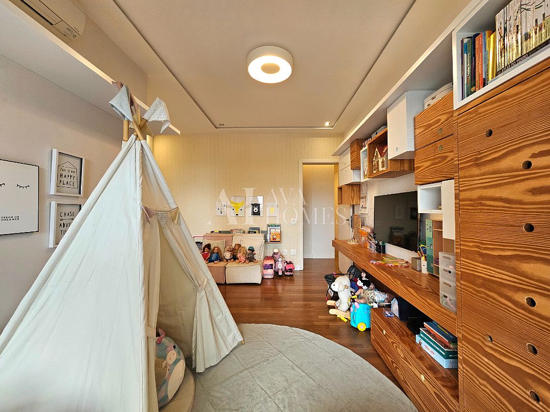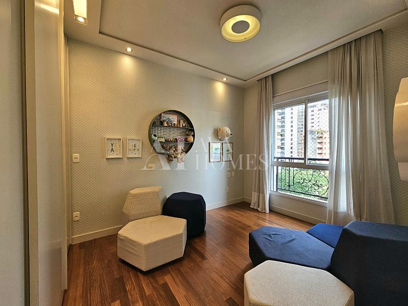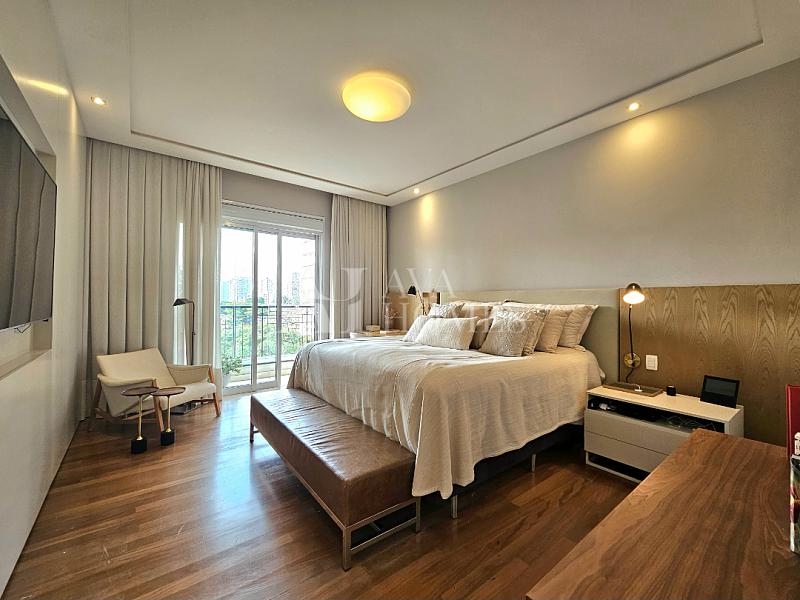 Na ala íntima, quatro suítes com piso em madeira e marcenaria Augusto Moreno, reconhecida pela qualidade dos materiais e acabamentos. Banheiros com aquecimento de piso, desembaçador de espelho e revestidos em mármore, mantendo a linguagem do projeto.
