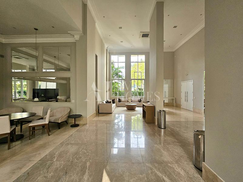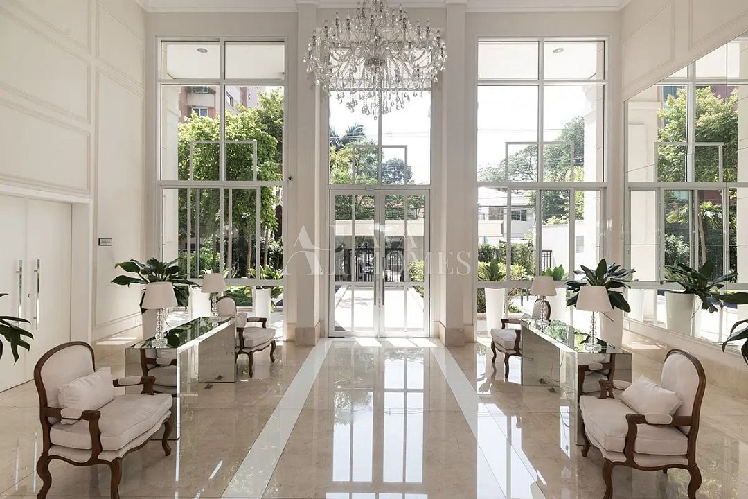 Logo na chegada, o hall social já antecipa o clima do apartamento: elegante, bem resolvido e marcado por proporções generosas em seus 400 m² e pé-direito alto em todos os ambientes.