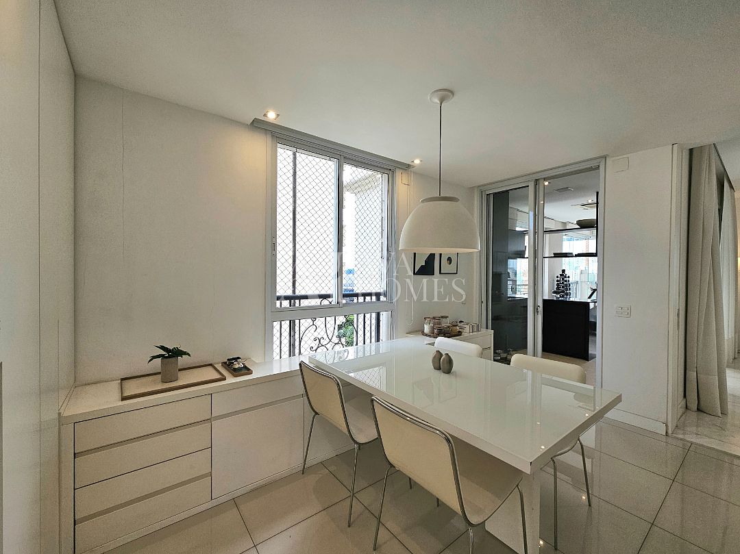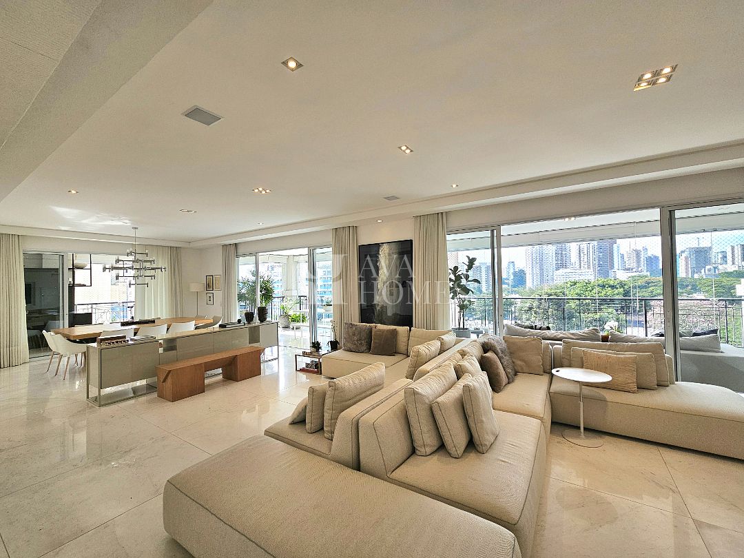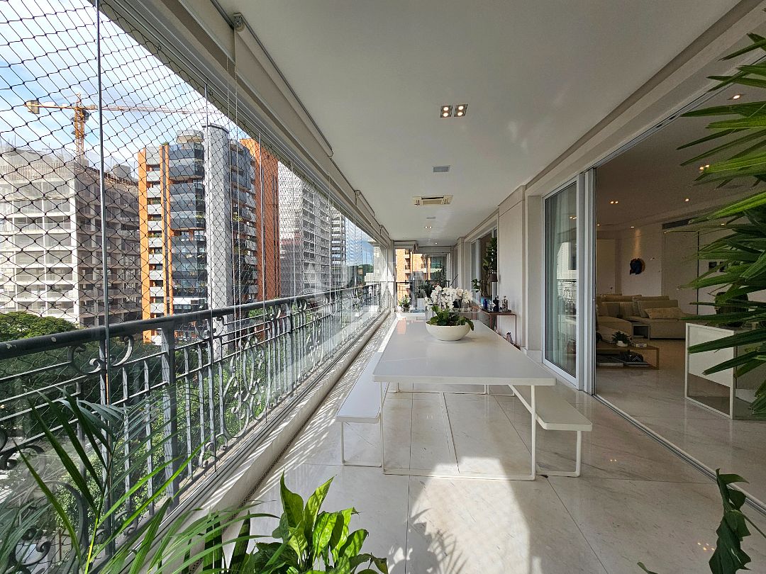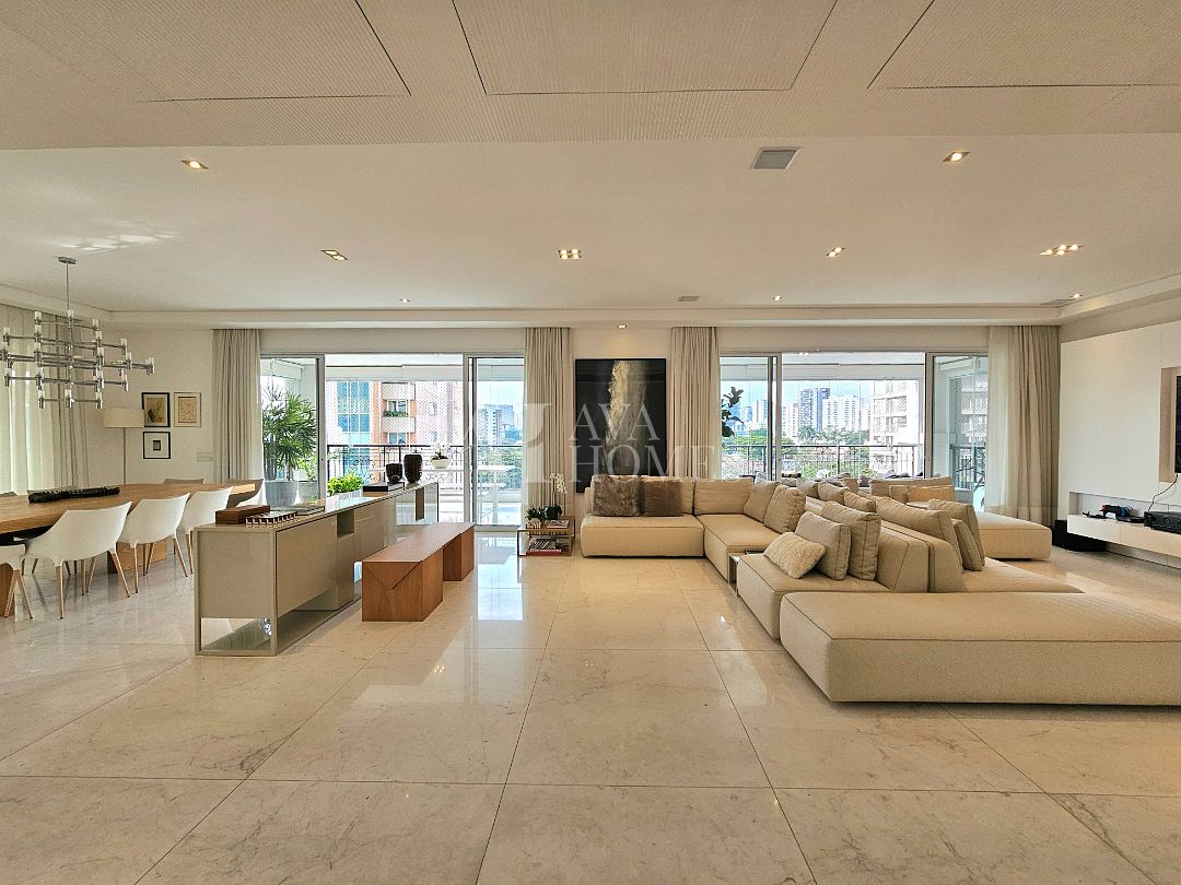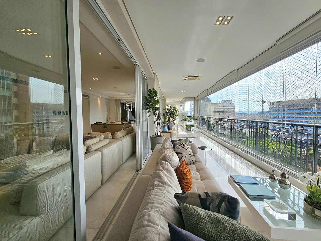A área social tem piso em mármore, integração entre os ambientes e sistema de som e automação de iluminação Lutron. A varanda em L percorre toda a extensão da sala, conectando o living, a sala de jantar e o espaço gourmet, que também se abre para a sala de almoço.