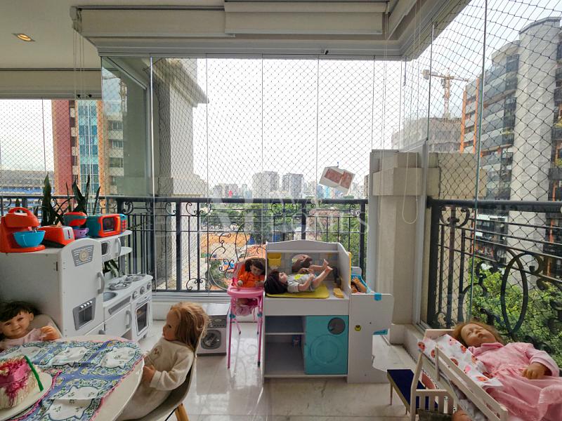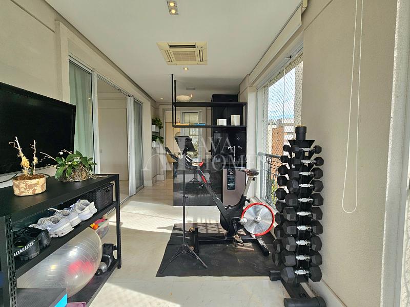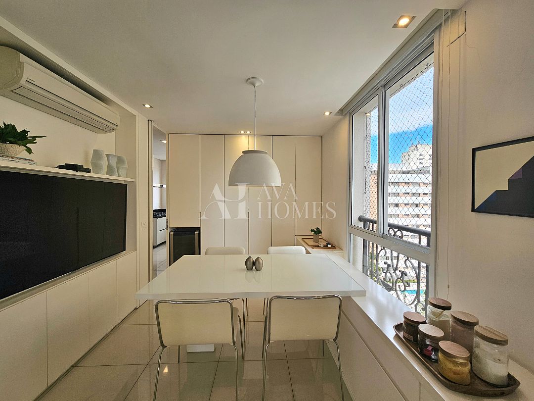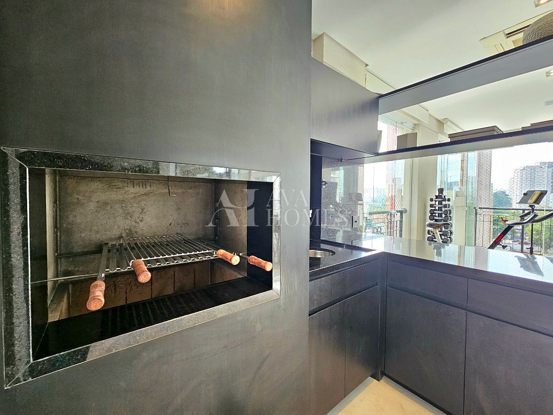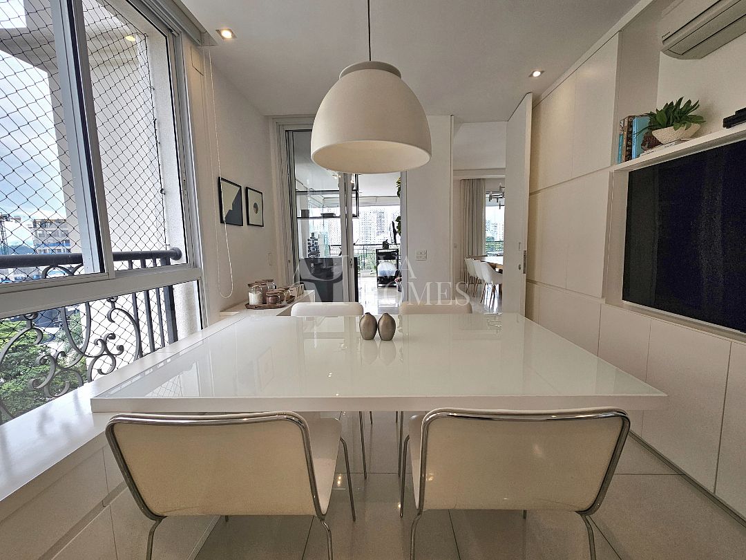 A área social tem piso em mármore, integração entre os ambientes e sistema de som e automação de iluminação Lutron. A varanda em L percorre toda a extensão da sala, conectando o living, a sala de jantar e o espaço gourmet, que também se abre para a sala de almoço.