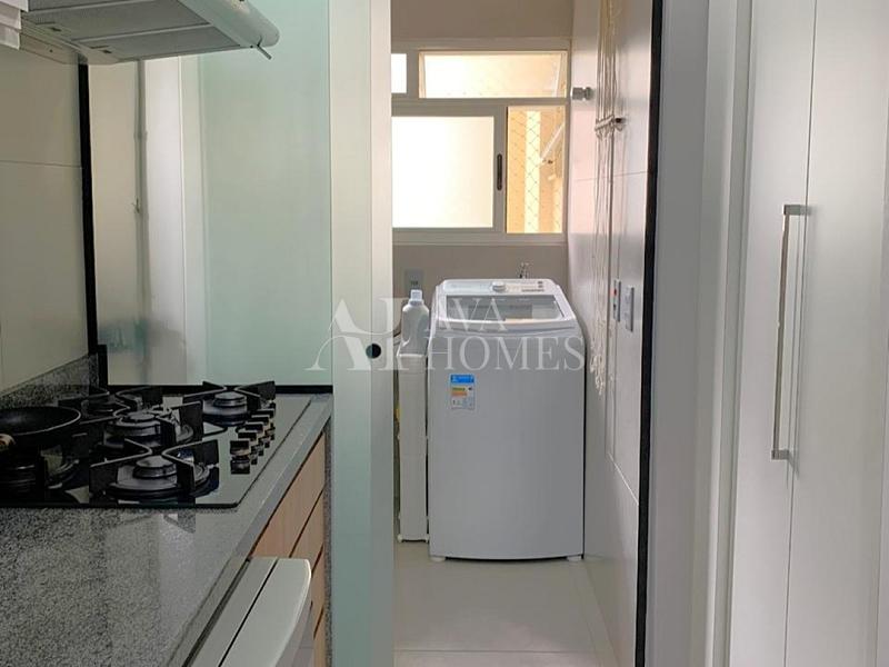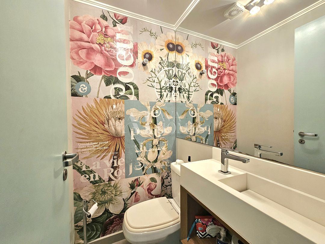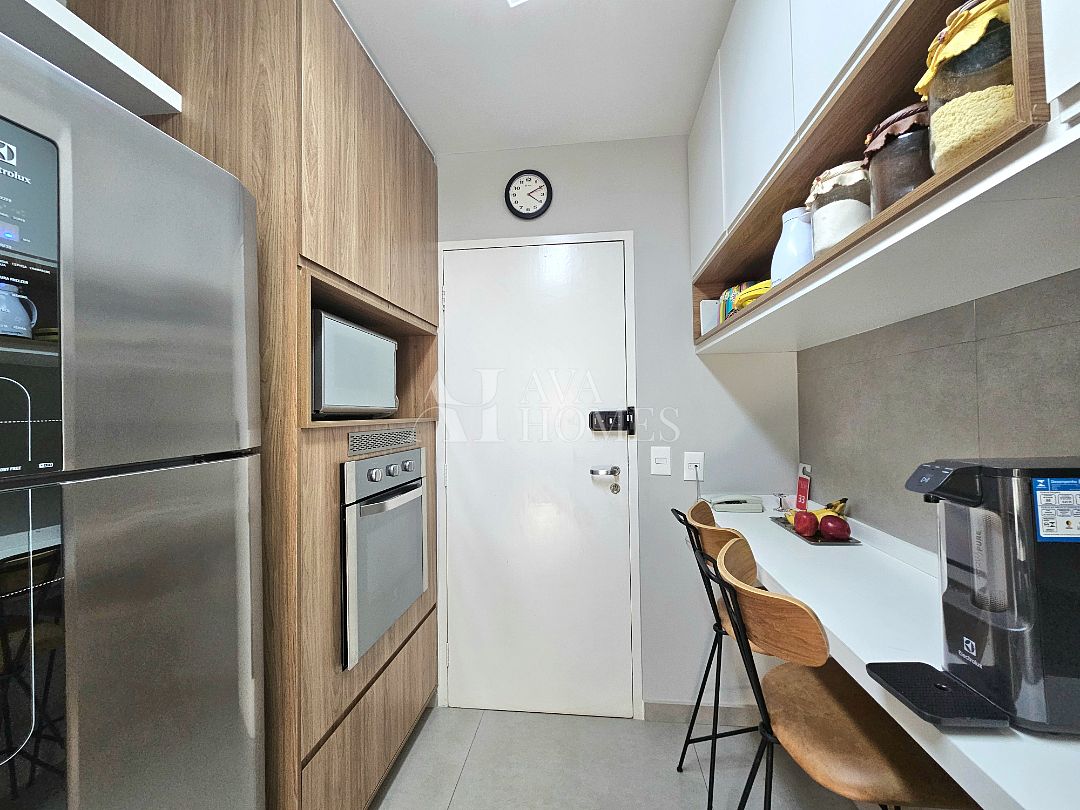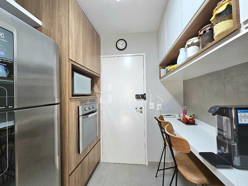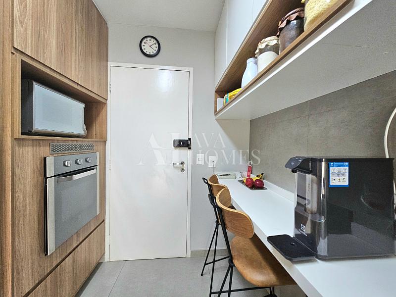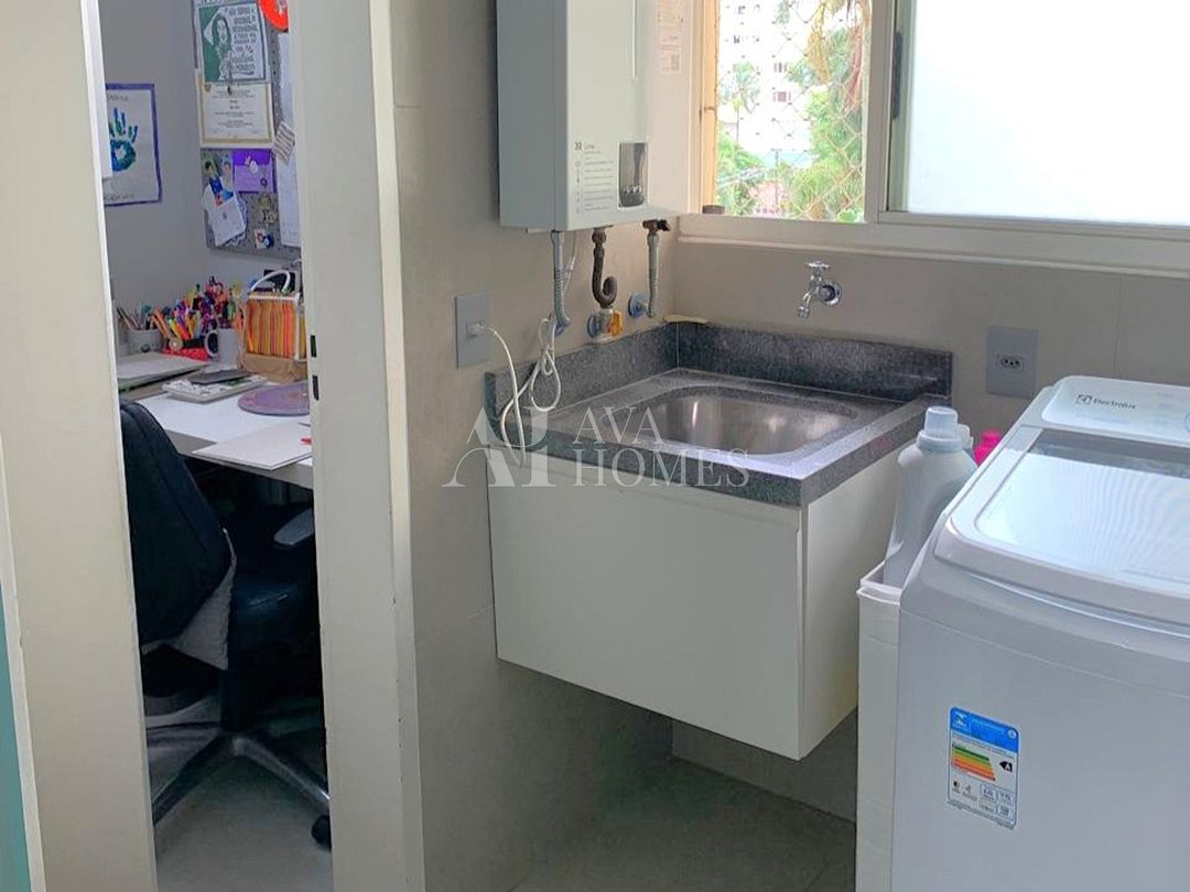 O apartamento tem uma planta bem distribuída, com living para dois ambientes com piso de madeira, varanda integrada à sala, lavabo, cozinha planejada, despensa e lavanderia com quarto de serviço, atualmente utilizado como escritório, enquanto o banheiro de serviço foi convertido em despensa.