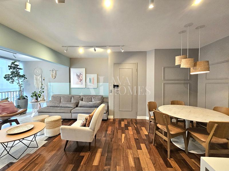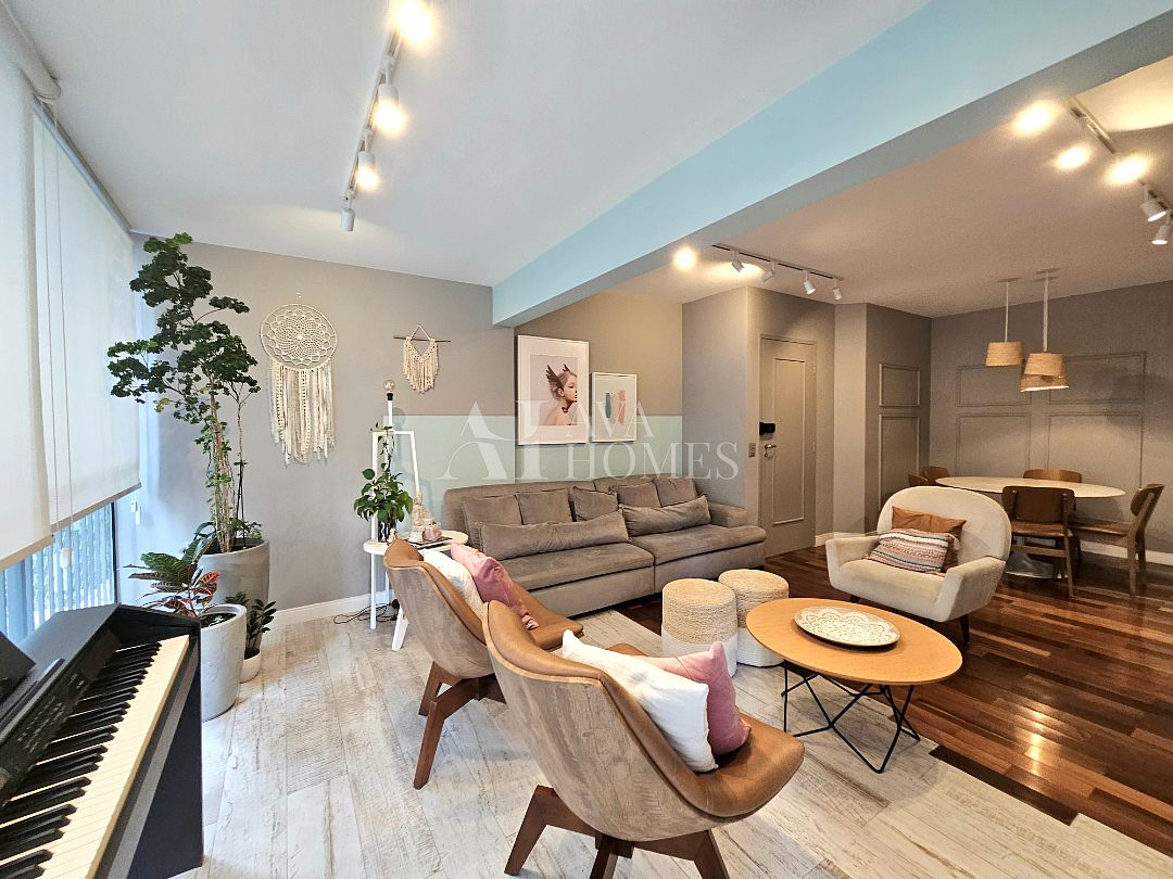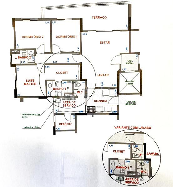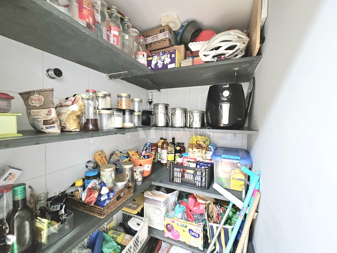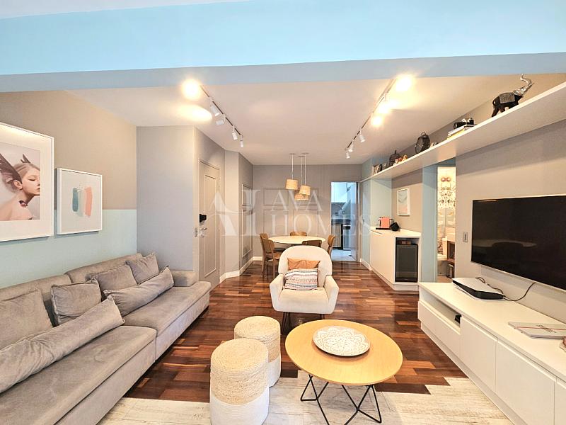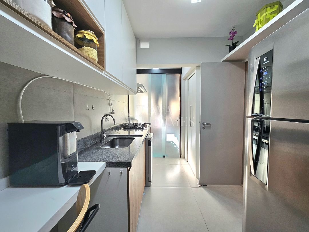 O apartamento tem uma planta bem distribuída, com living para dois ambientes com piso de madeira, varanda integrada à sala, lavabo, cozinha planejada, despensa e lavanderia com quarto de serviço, atualmente utilizado como escritório, enquanto o banheiro de serviço foi convertido em despensa.