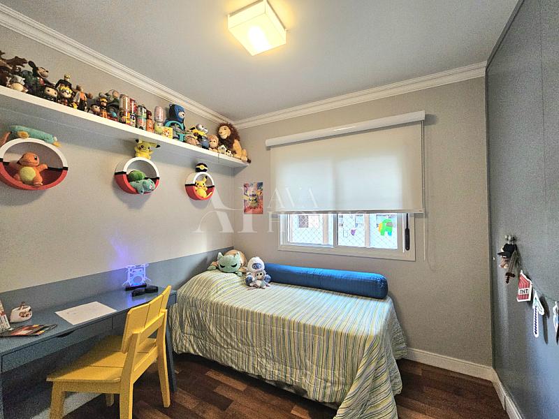 Na área íntima, são três quartos com piso madeira, sendo uma suíte com closet.