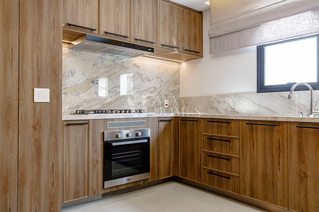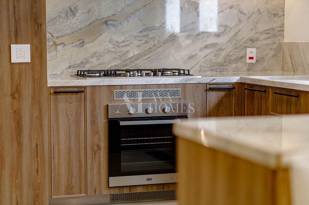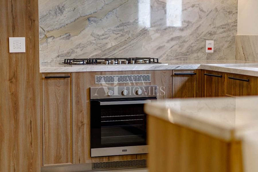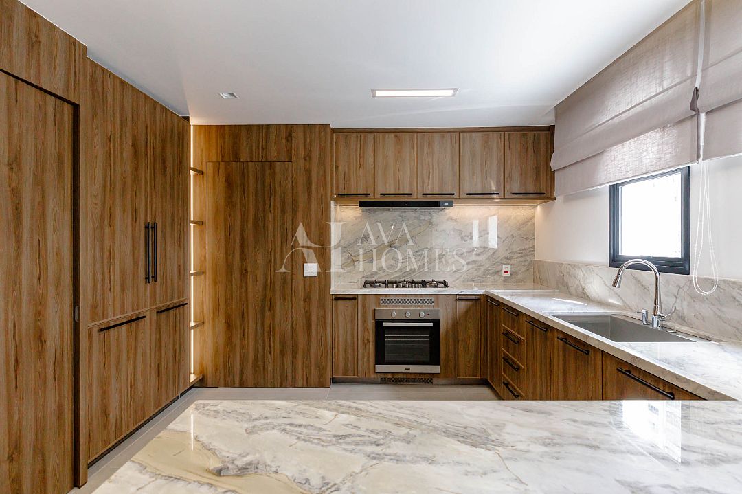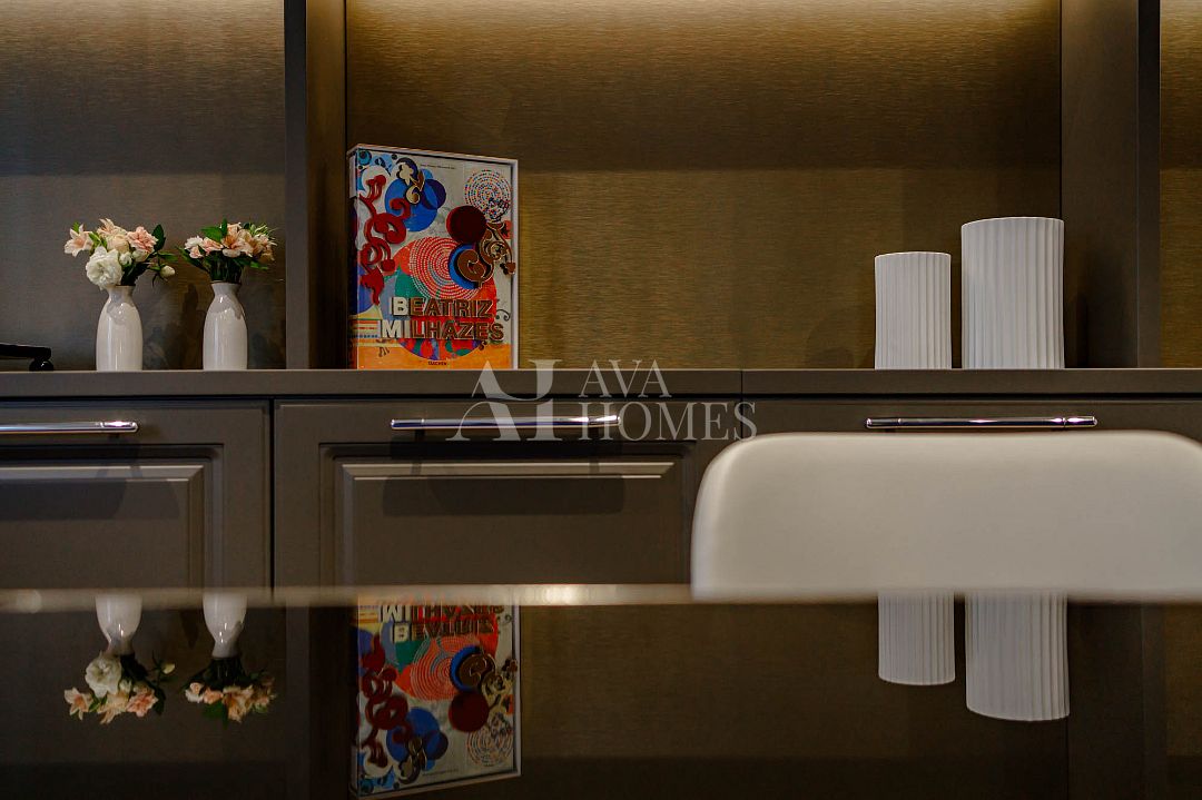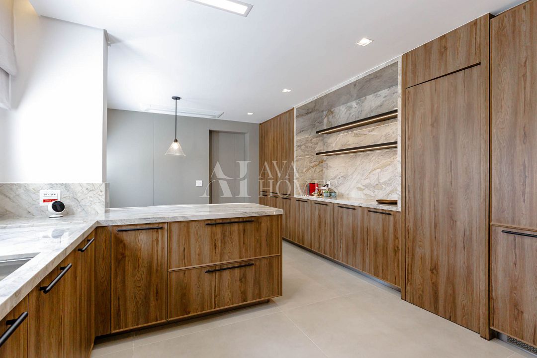 Cozinha totalmente equipada com eletrodomésticos importados, geladeiras e máquina de lavar louça embutidas na marcenaria.