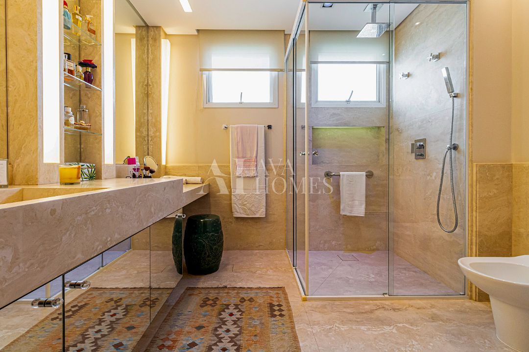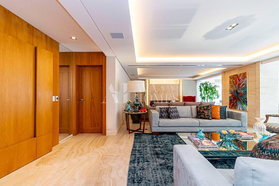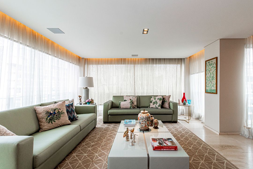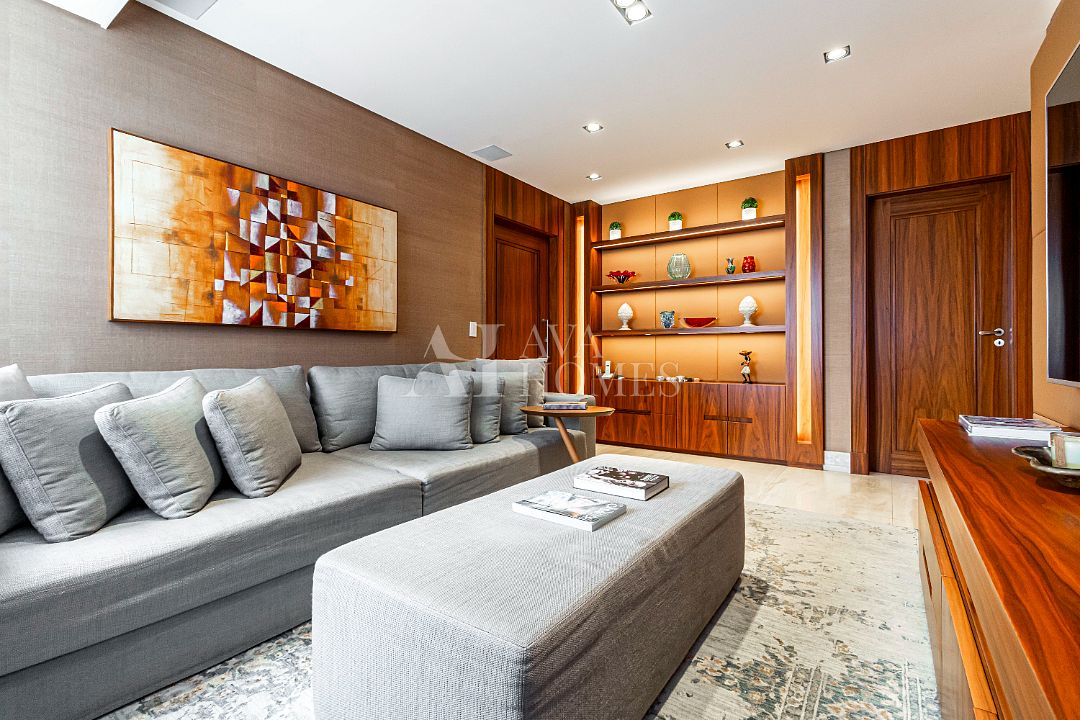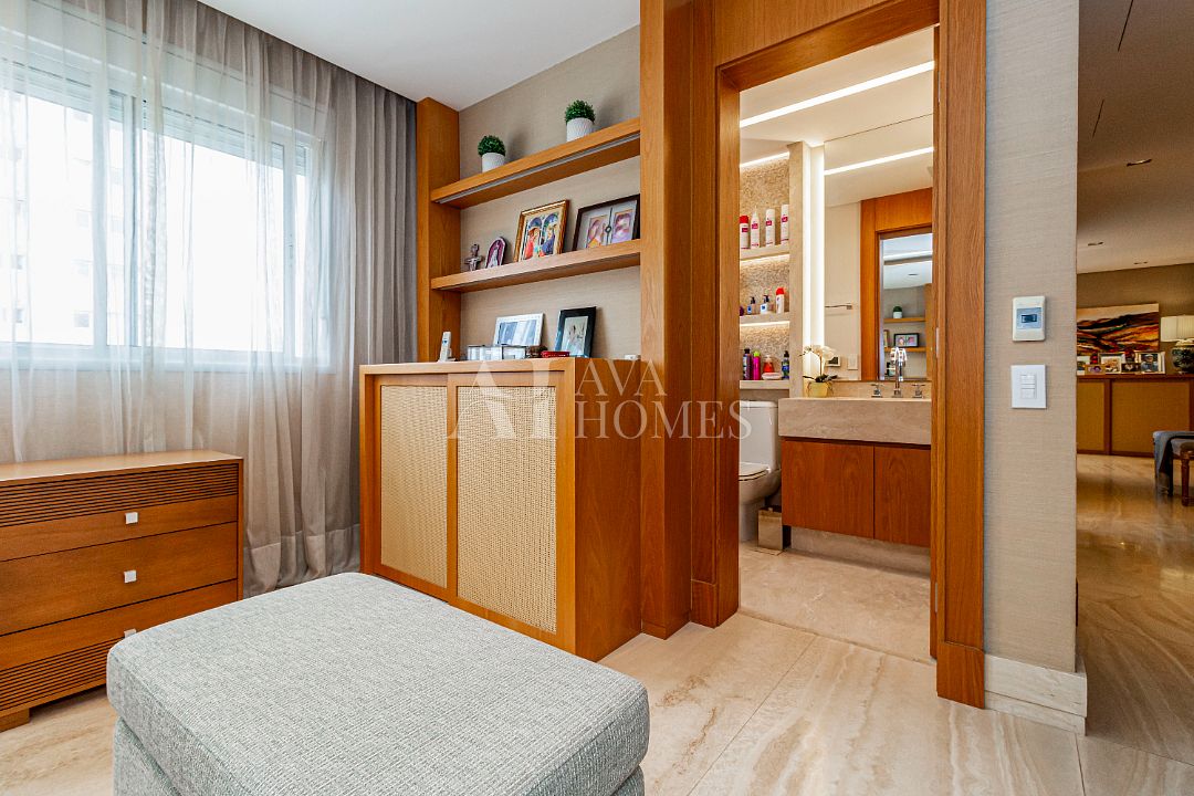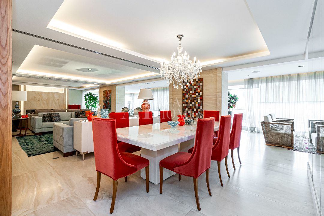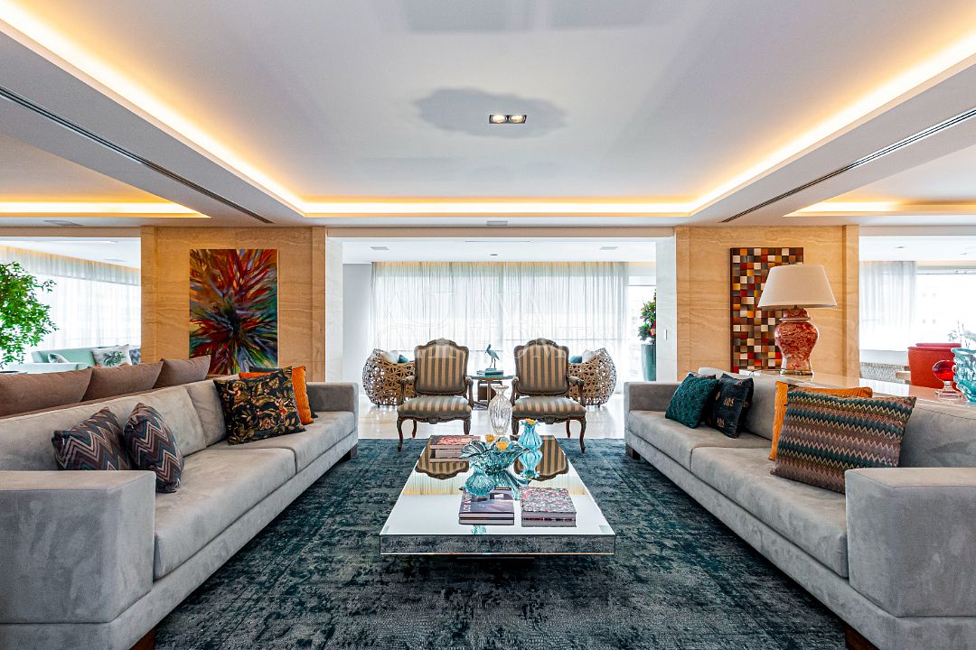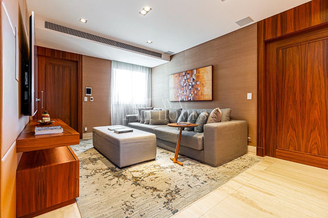 Estamos falando de um apartamento com grife: projeto impecável da arquiteta Débora Aguiar, execução pela Foz Engenharia e iluminação assinada por Guinter Parschalk (sim, o cara do Hotel Unique). Tudo isso em 370m² revestidos em mármore travertino, onde cada canto grita sofisticação e tecnologia de ponta.