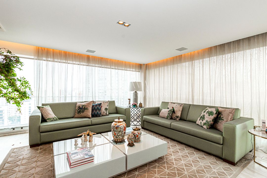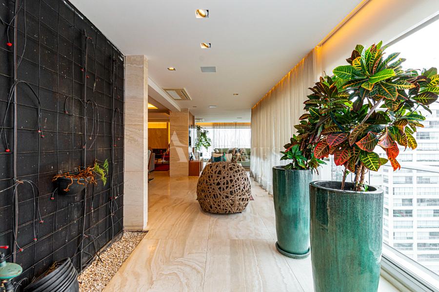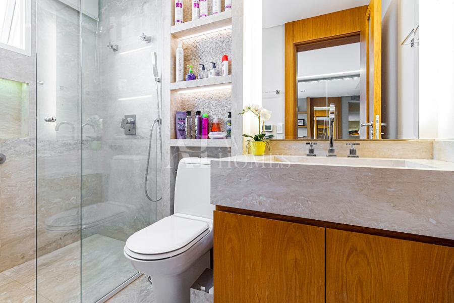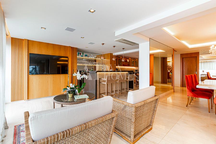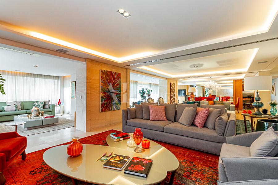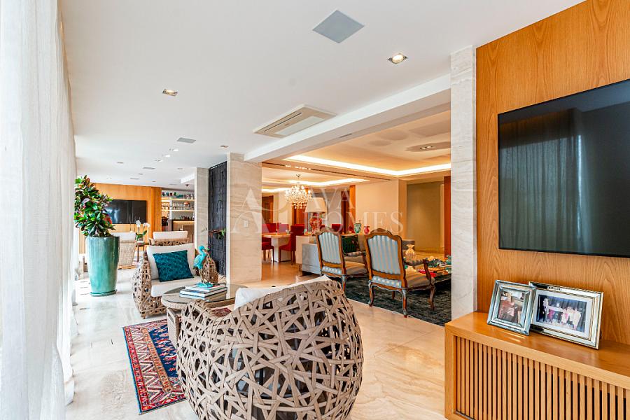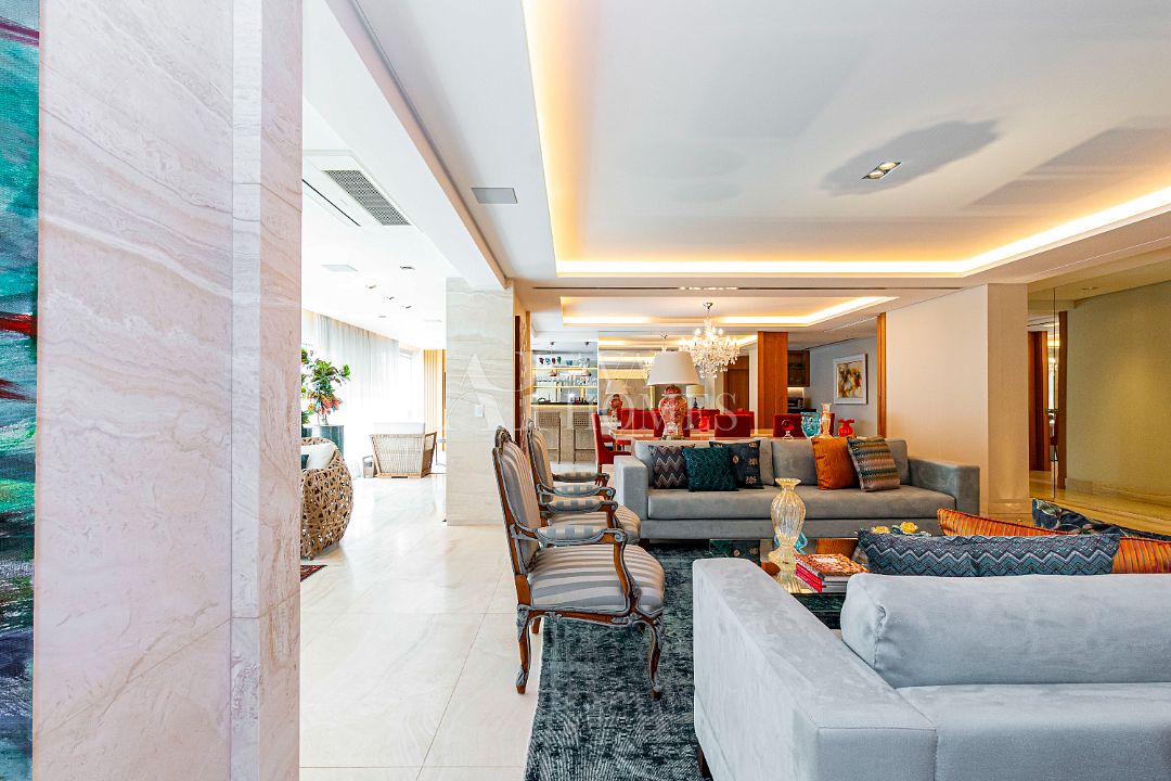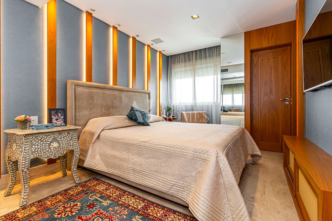 Estamos falando de um apartamento com grife: projeto impecável da arquiteta Débora Aguiar, execução pela Foz Engenharia e iluminação assinada por Guinter Parschalk (sim, o cara do Hotel Unique). Tudo isso em 370m² revestidos em mármore travertino, onde cada canto grita sofisticação e tecnologia de ponta.