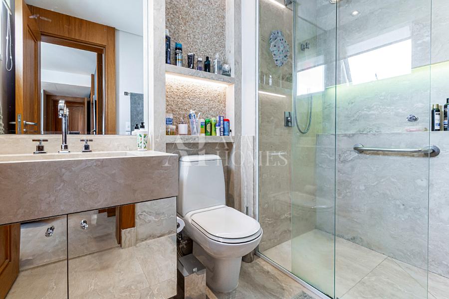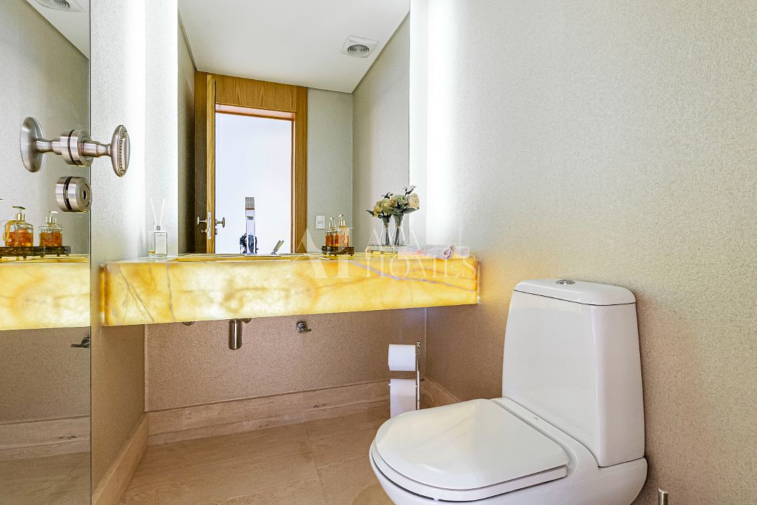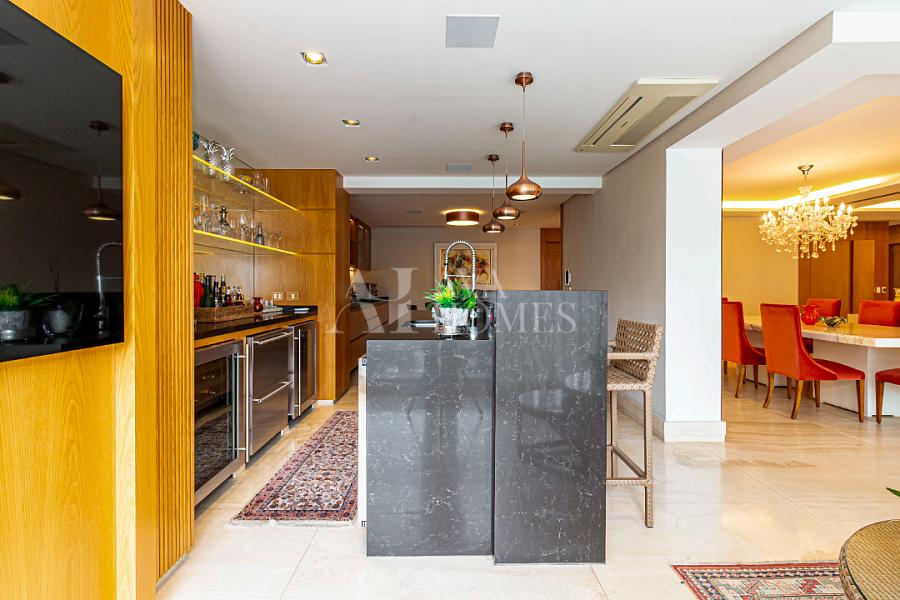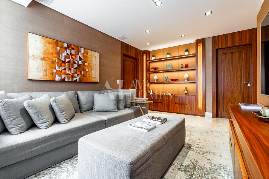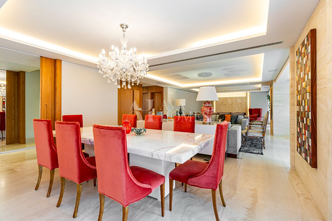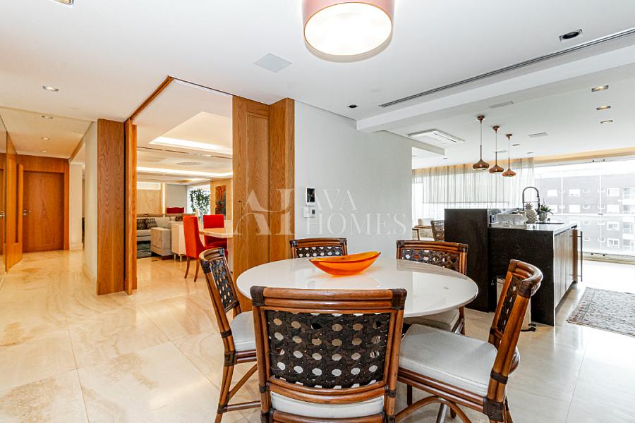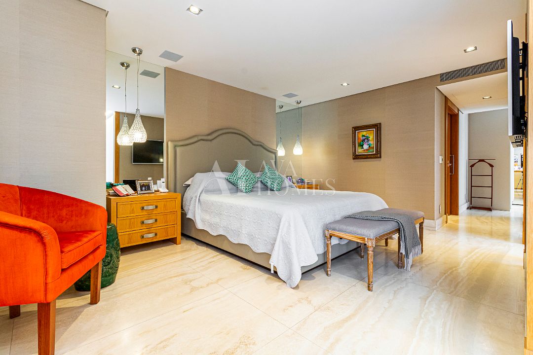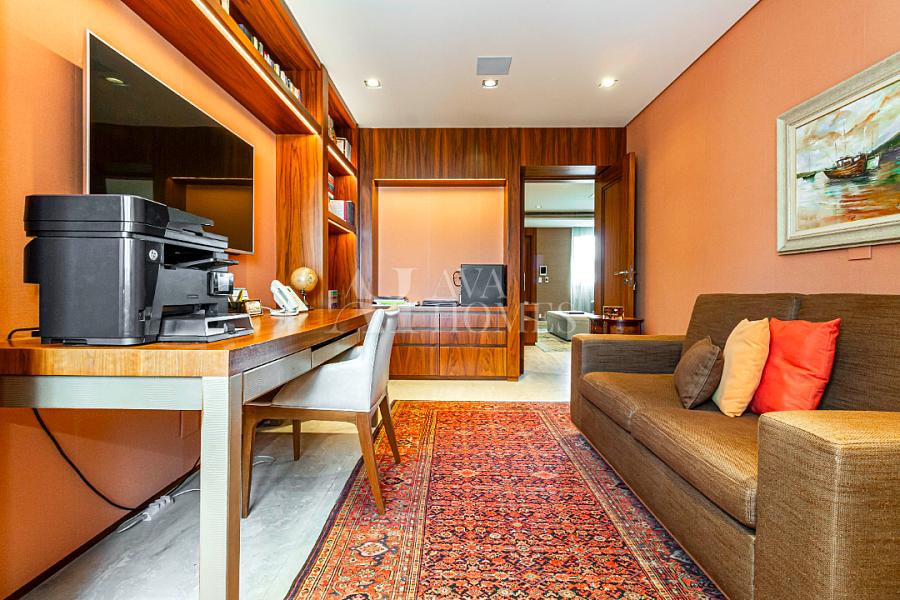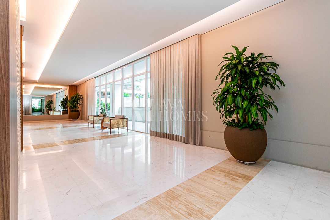 Estamos falando de um apartamento com grife: projeto impecável da arquiteta Débora Aguiar, execução pela Foz Engenharia e iluminação assinada por Guinter Parschalk (sim, o cara do Hotel Unique). Tudo isso em 370m² revestidos em mármore travertino, onde cada canto grita sofisticação e tecnologia de ponta.