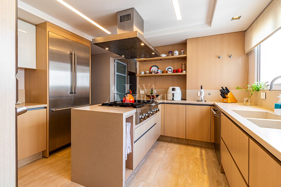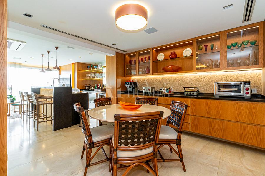 E por falar em som, são 40 speakers espalhados estrategicamente (pensa numa festa onde cada música bate do jeito certo). A cozinha e os closets? Kitchens, meu bem. E a área gourmet? Um verdadeiro sonho para qualquer anfitrião, com tudo da linha Thermador (Gaggenau), adega, máquina de gelo, gavetas refrigeradas e até as geladeiras parecem dignas de um reality gastronômico.