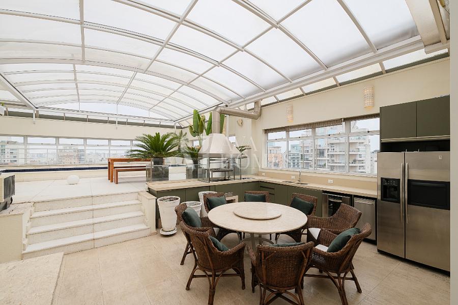 No piso superior, você encontrará um home theater, uma sala para receber amigos integrada a uma completa área gourmet, uma piscina e uma jacuzzi. Essa área é perfeita para momentos de lazer e entretenimento, com o benefício adicional de um teto retrátil, permitindo que você desfrute dos dias ensolarados ao ar livre. Além disso, a cobertura oferece uma sauna com cromoterapia e uma cozinha de apoio, garantindo o máximo de comodidade.