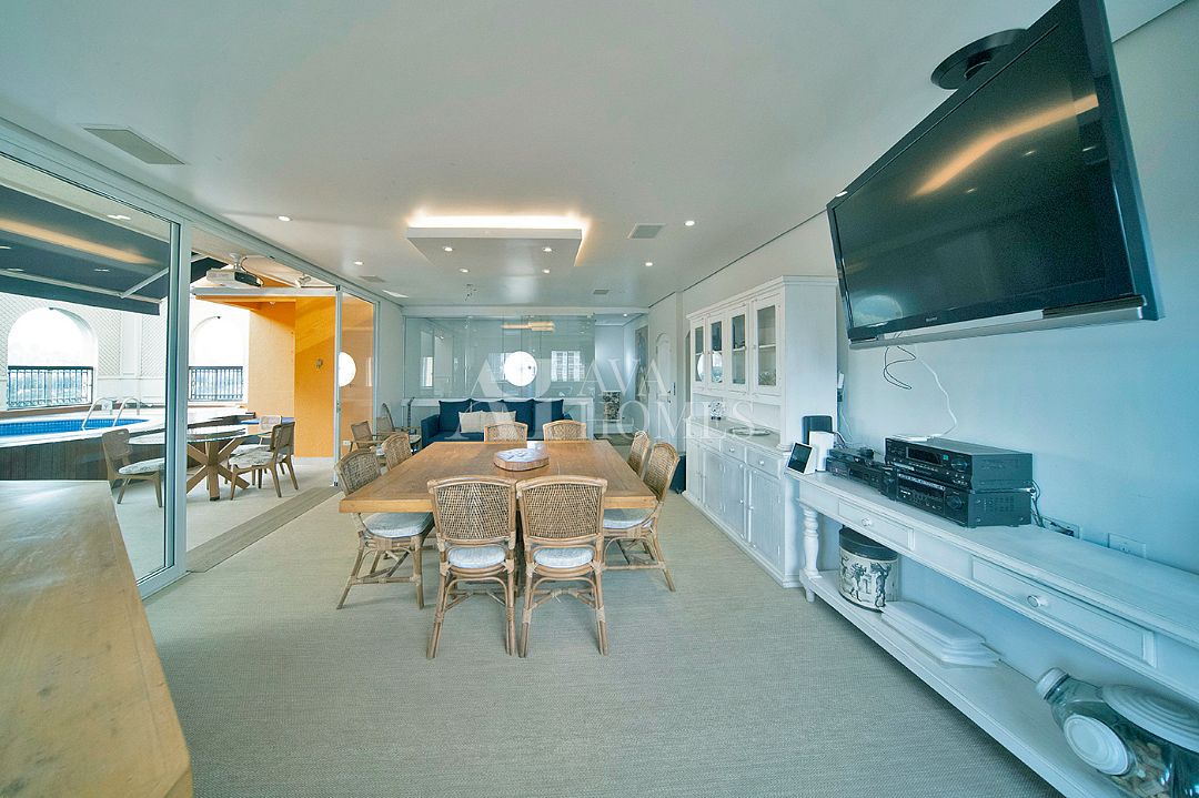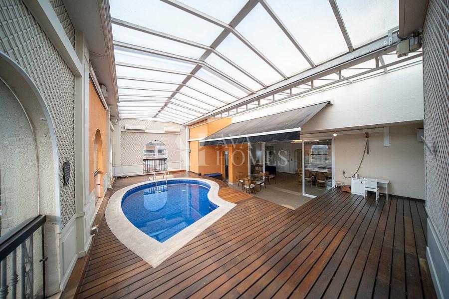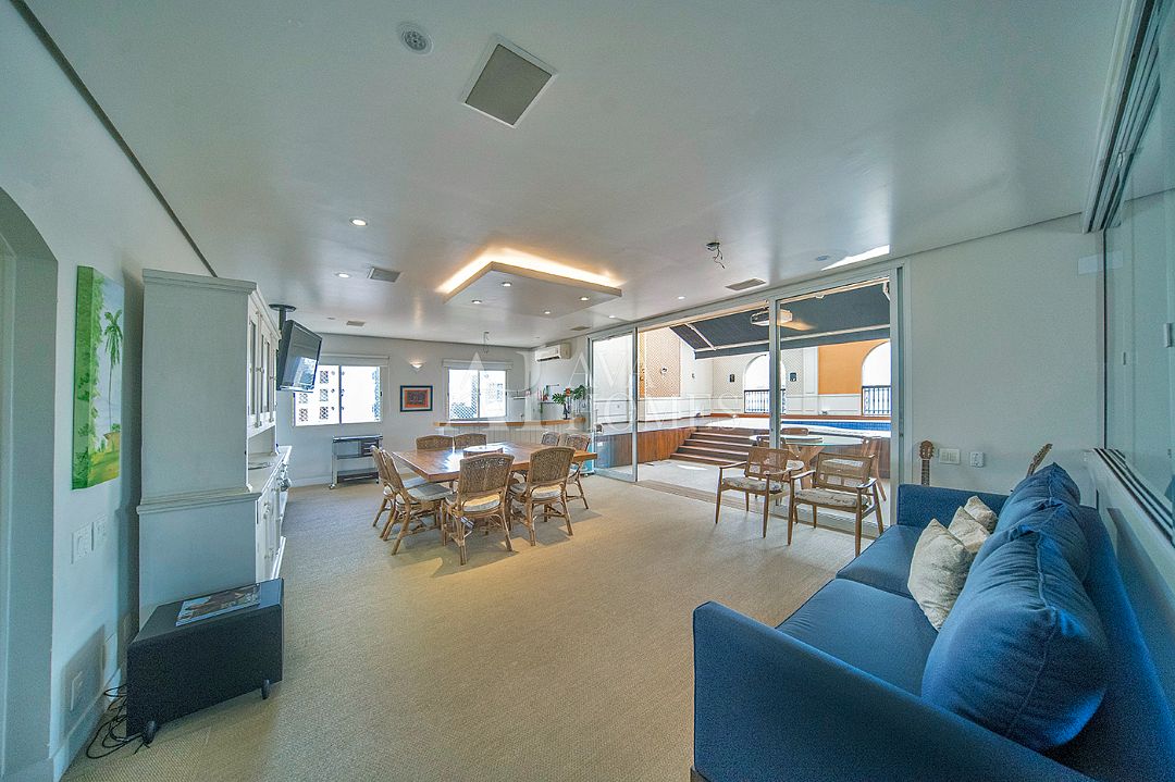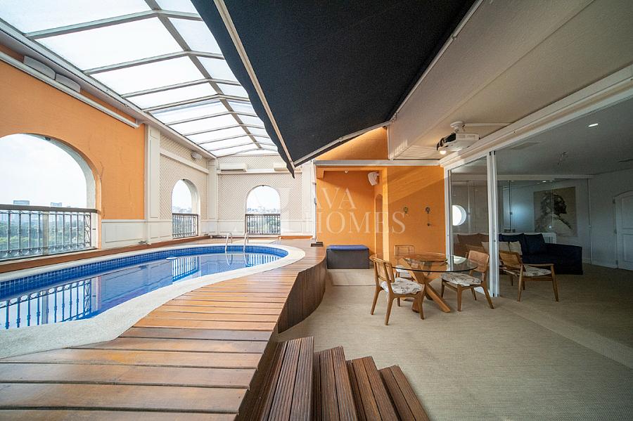 Ampla área fechada com bar e área de piscina com fechamento de teto retrátil;