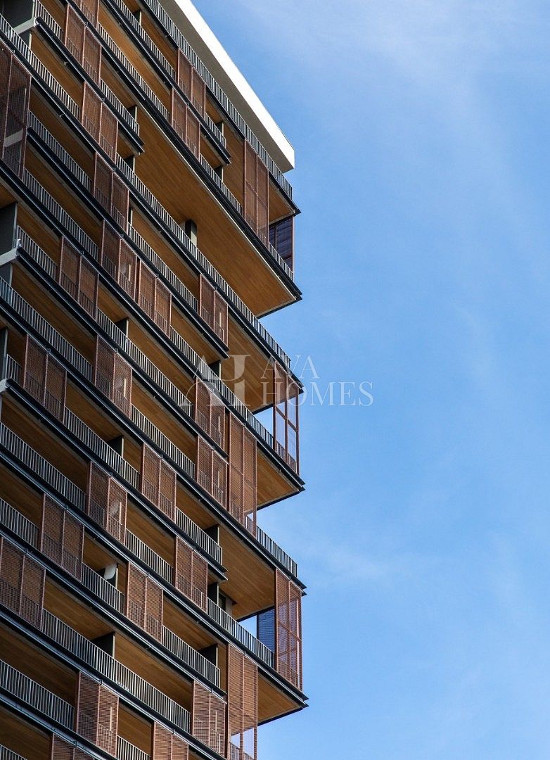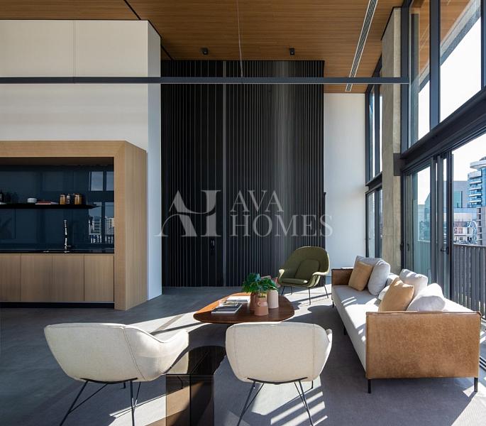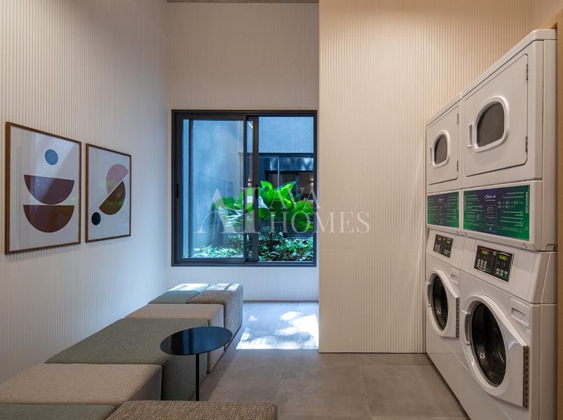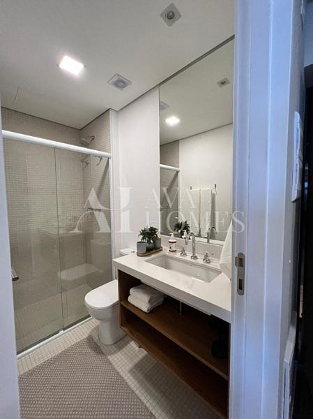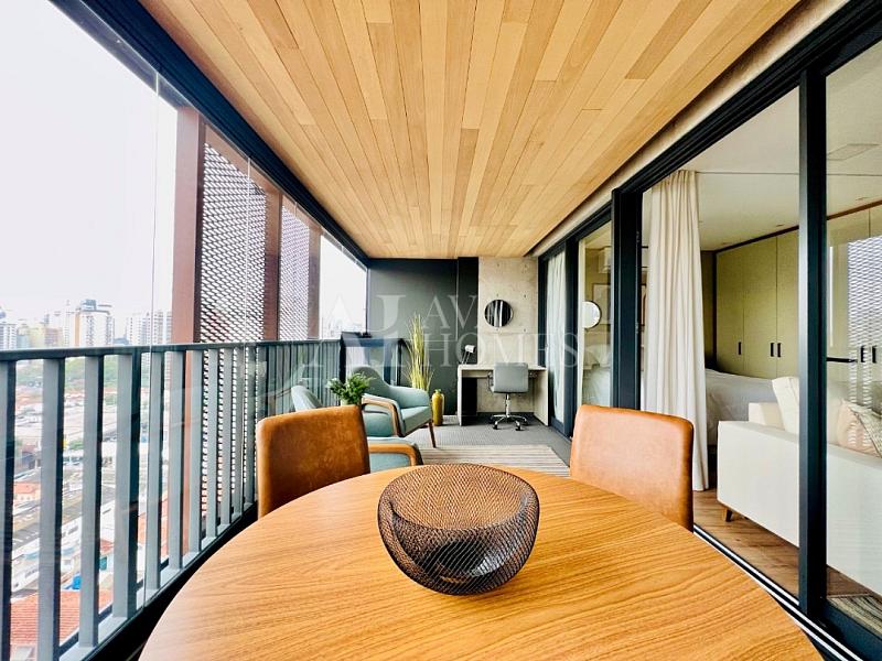 Espaço de 49m², com varanda ampla, ambiente para sala, cozinha, área de serviço e banheiro. Caixilhos de alumínio e abertura ampla favorecem a integração da sala com a varanda, forro de madeira na varanda com iluminação embutida, forro de gesso em todos os ambientes internos, pé-direito de 2,50 metros na área interna do apartamento, aquecimento central de água, água quente na cozinha e banheiro e tomada USB.